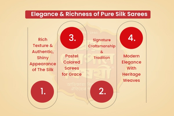 Priya Gopal Bishoyi believes that the elegance of a saree is defined by its fabric, and they sell several pure silk sarees, including rich textures. So, what defines the rich texture and authentic sheen of a pure silk saree? The points are: