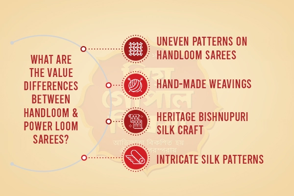 Handloom and power loom sarees are produced using different techniques. Handloom sarees are generally woven by local and skilled artisans manually with the help of traditional looms. Such manual work helps in crafting unique textures, creating intricate patterns, and a little inequality in designs makes them look authentic and special. On the other hand, power loom sarees are purely machine-made, where automated machines are used for mass production and speed. So, the development of power loom sarees using machines led to less uniqueness and distinctive fabrics.