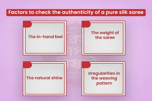 No matter how genuinely a pure silk saree is handwoven, it’s bound to feel a little heavier than usual sarees. The weight is of the pure silk threads used to weave the premium saree. At the very best, you can expect a balanced weight with a rich, glossy look from a genuine silk saree. Unlike that, fake ones are more likely to feel much lighter, more like a synthetic saree. If your pure silk doesn’t feel weighty, you must cross-check the authenticity of the saree.