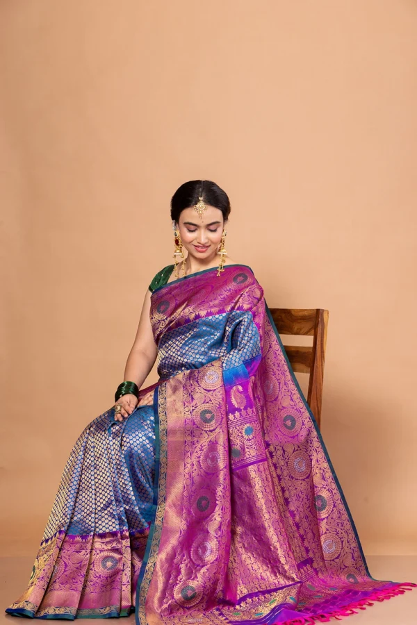 Refresh regal charm with this Cobalt Blue Pure Gadwal Silk Saree, expertly crafted from pure handwoven silk. Featuring intricate peacock motifs and shimmering zari brocade, it reflects timeless elegance and traditional craftsmanship. The saree comes with a matching blouse piece and carries the Silk Mark, assuring authenticity and premium quality. Perfect for weddings, festivals, and grand occasions, its rich cobalt hue Upgrades every celebration with sophistication. Designed for lasting beauty, this luxurious saree requires dry cleaning only. A true statement piece, it seamlessly blends heritage artistry with contemporary style for an unforgettable ensemble.