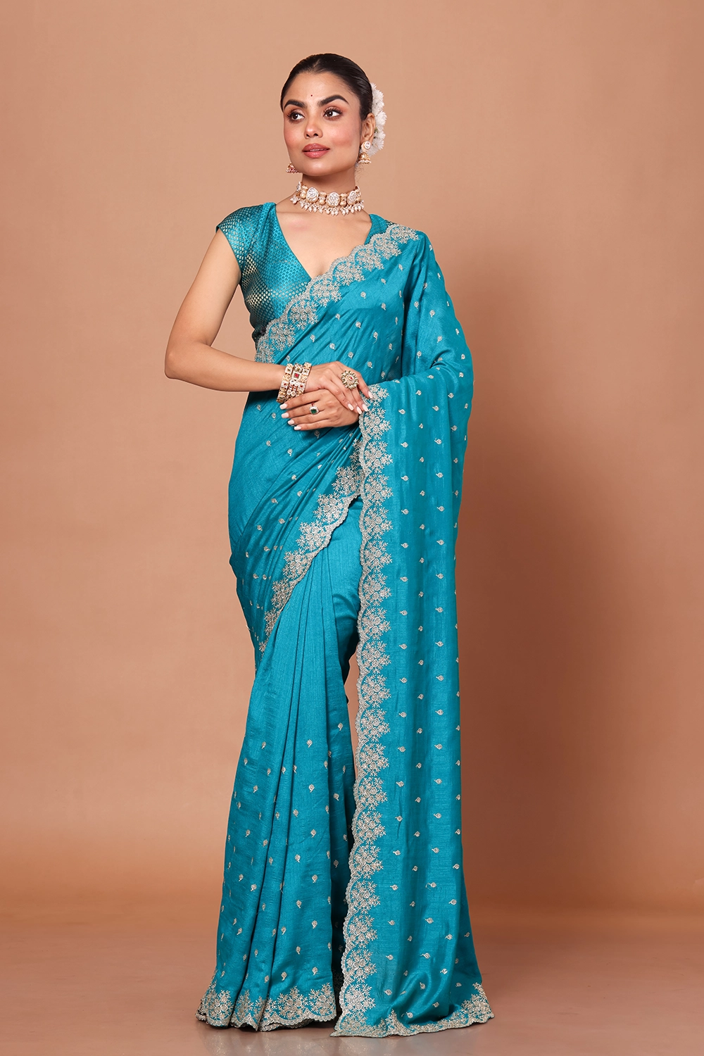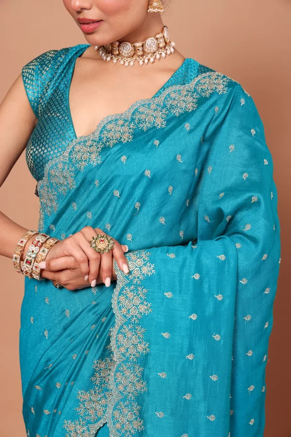 Turquoise Blue Designer Embroidery Saree