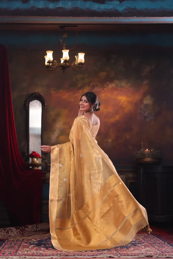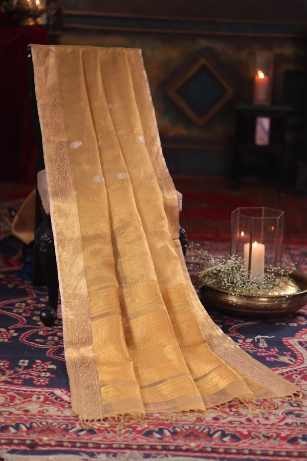 Shine in the warm radiance of this exquisite Light Copper Tissue Handloom Saree. The delicate Tissue silk fabric is finely handwoven, creating a subtle metallic glow and a beautiful, lightweight drape. The body features an all-over shimmer, perfectly framed by an elegant, traditional woven zari border and pallu with intricate motifs. This saree exudes understated luxury, offering a blend of traditional craftsmanship and modern elegance. Ideal for formal day events, festive occasions, and evening celebrations where you want to radiate sophistication.