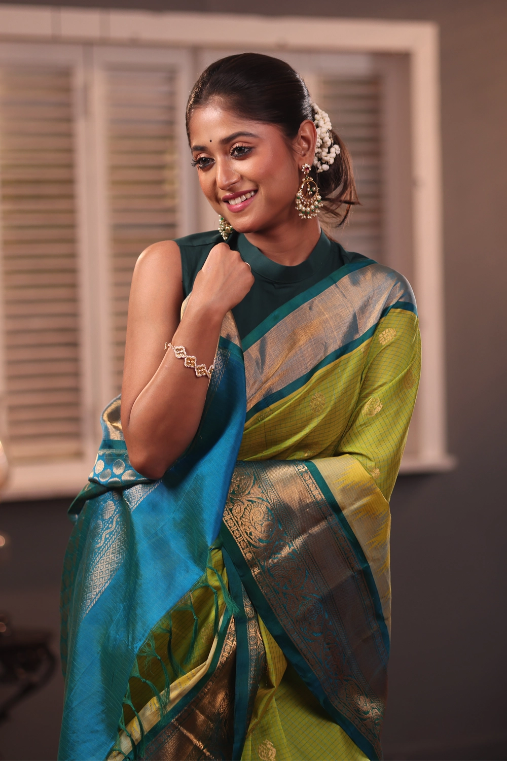 Drape yourself in the sophisticated charm of this Dark Olive Kuppadam Silk Saree. The luminous Kuppadam silk fabric features a beautiful, rich sheen in a unique dark olive green hue. This is dramatically contrasted by the stunning deep teal and gold zari border, which is wide and intricately woven with traditional motifs. The vibrant combination of the olive body and the teal-gold accents makes for an exceptionally rich and royal look. Perfect for traditional ceremonies, festive celebrations, and wedding functions, this saree is a true heirloom piece.