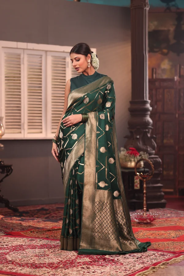 Channel majestic elegance with this captivating Deep Forest Green Fancy Mashru Satin Saree. Crafted from luxurious Mashru Satin, its rich, dark green hue offers a sophisticated drape and a beautiful sheen. The body is adorned with elegant golden woven motifs that stand out against the deep background, adding a touch of classic grandeur. A magnificent, broad gold zari border and pallu feature intricate patterns, elevating the saree to an heirloom piece. Perfect for grand celebrations, evening events, and traditional ceremonies where you desire to exude understated luxury.