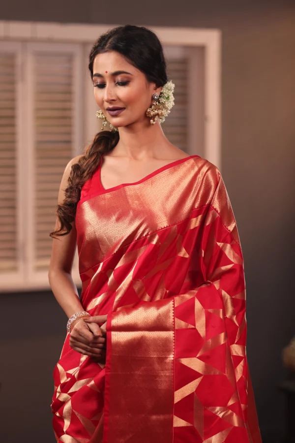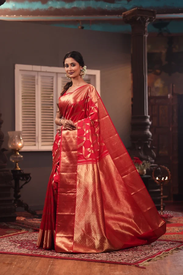 Embrace unparalleled glamour in this stunning Dark Red Special Arni Silk Saree. Woven from rich Arni silk, renowned for its magnificent luster and soft drape, this saree captures attention instantly. The vibrant red body is adorned with an intricate, contemporary geometric zari weave in a radiant gold, offering a modern twist to traditional artistry. A broad, solid gold border frames the look, enhancing its opulence. Perfect for weddings, reception parties, and festive occasions where you want to make a bold, sophisticated statement.