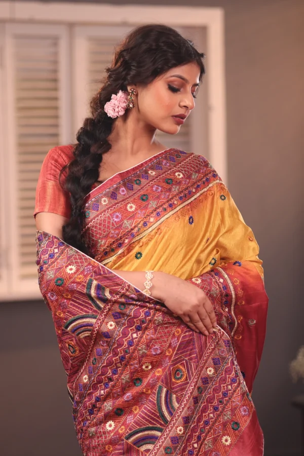 Celebrate traditional artistry with this captivating Light Orange Fancy Art Tussar Saree. The luminous Art Tussar silk features a rich, dual-tone effect in vibrant light orange and a deep cranberry red on the pallu. This stunning backdrop is covered in intricate, colorful Kantha-style embroidery with folk and geometric patterns, making it a true masterpiece of handwork. The contrasting and heavily embroidered pallu and border draw immediate attention. Ideal for festive gatherings, cultural events, or special occasions, this saree embodies the rich heritage of Indian textile crafts.