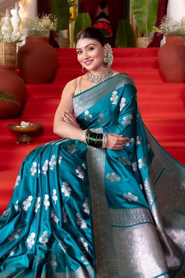 Make heads turn with the beautiful Teal Blue Fancy Mashru saree. The luxurious fabric, along with silver Zari motifs and a classic border, gives a royal appeal. You can pair it with traditional jewellery for a timeless look.