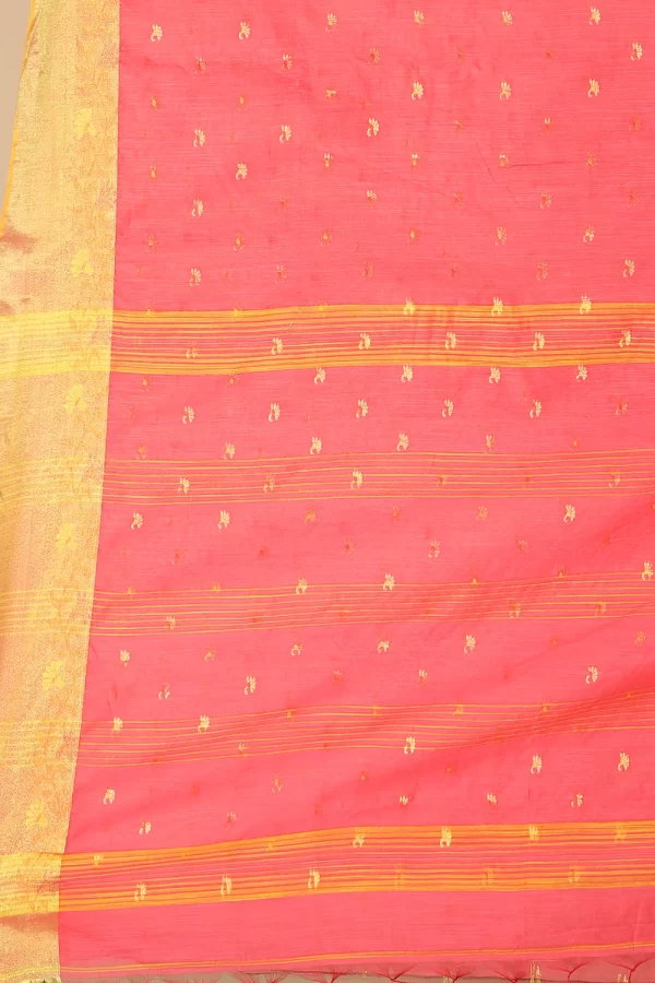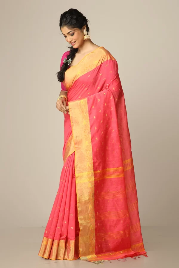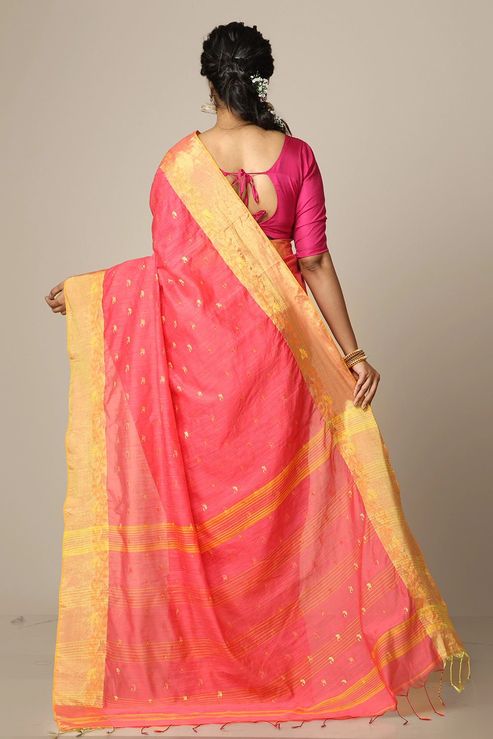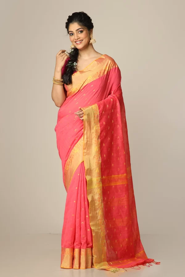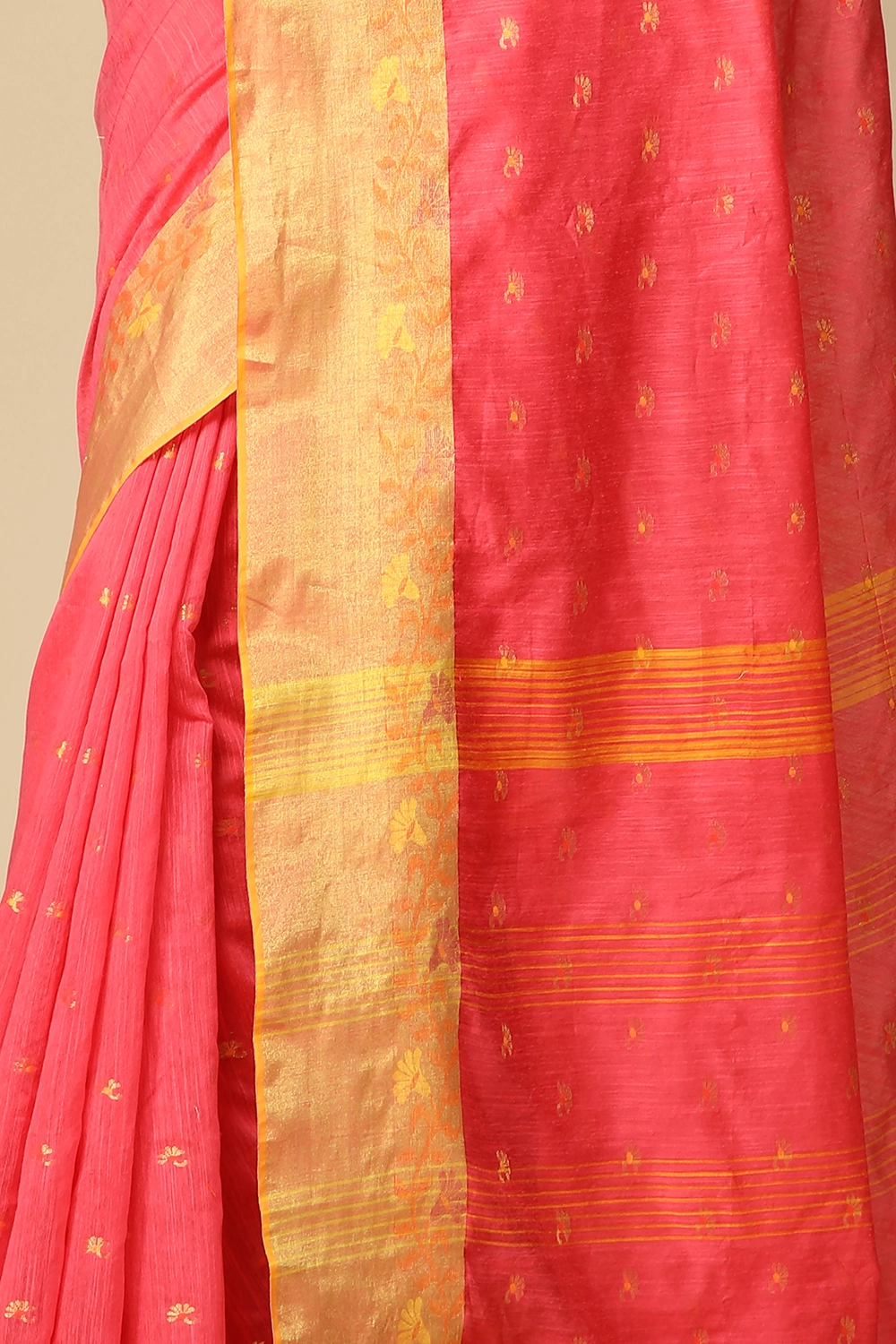 The Strawberry Pink Fancy Handloom Saree From Fulia, West Bengal Is Bordered By Zari Madhabilata On Blended Cotton. This Monochrome Non-Handwoven Ethnic Wear Saree Speaks Of Sophistication. Dry Clean To Last.