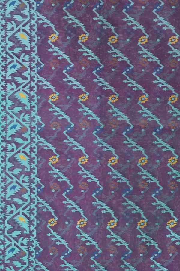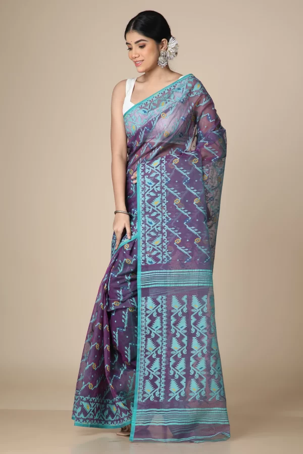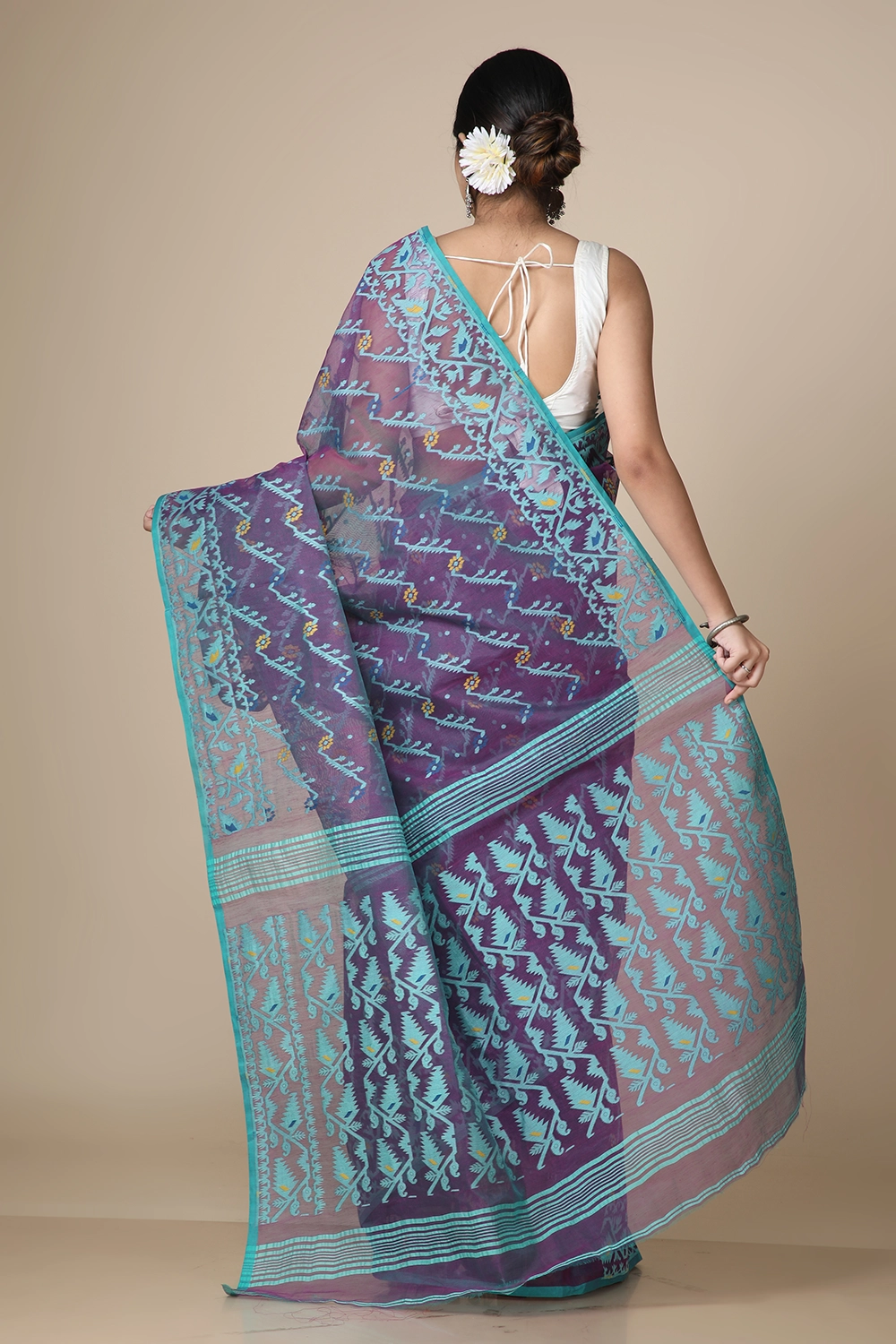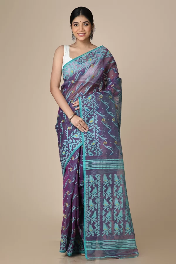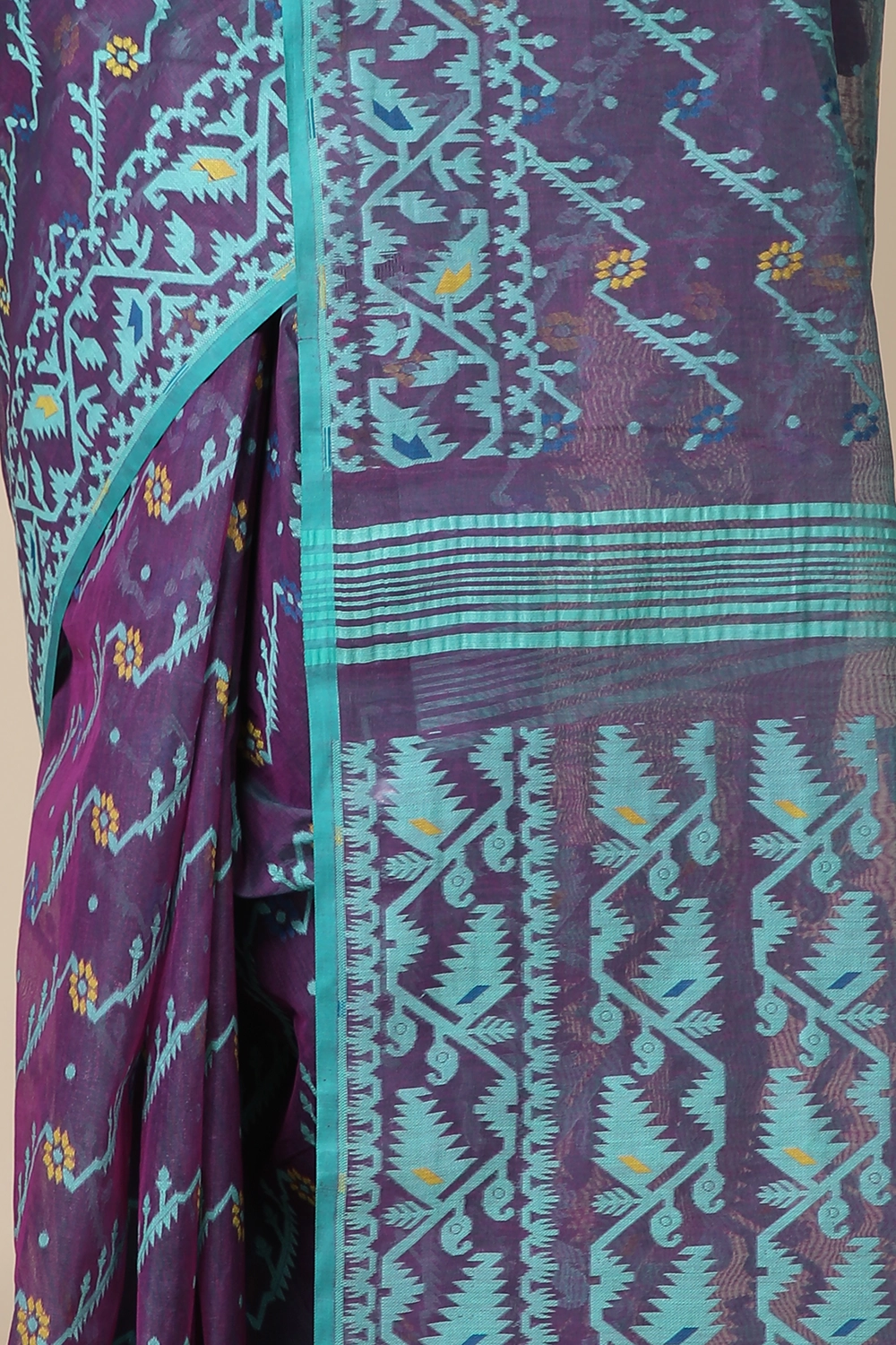 Welcome Elegance Into Your Life With This Dual-Tone Dhakai Jamdani Saree In Blended Cotton. It Comprises Meena With Zari Work And Is A Delightful Non-Handwoven Saree That Reminisces The Art Of Weaving From West Bengal. Best For Ethnic Occasions, Dry Cleaning Is Recommended Further For Preservation.