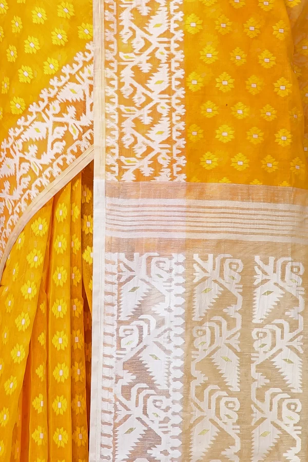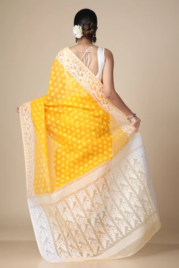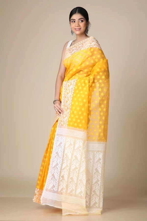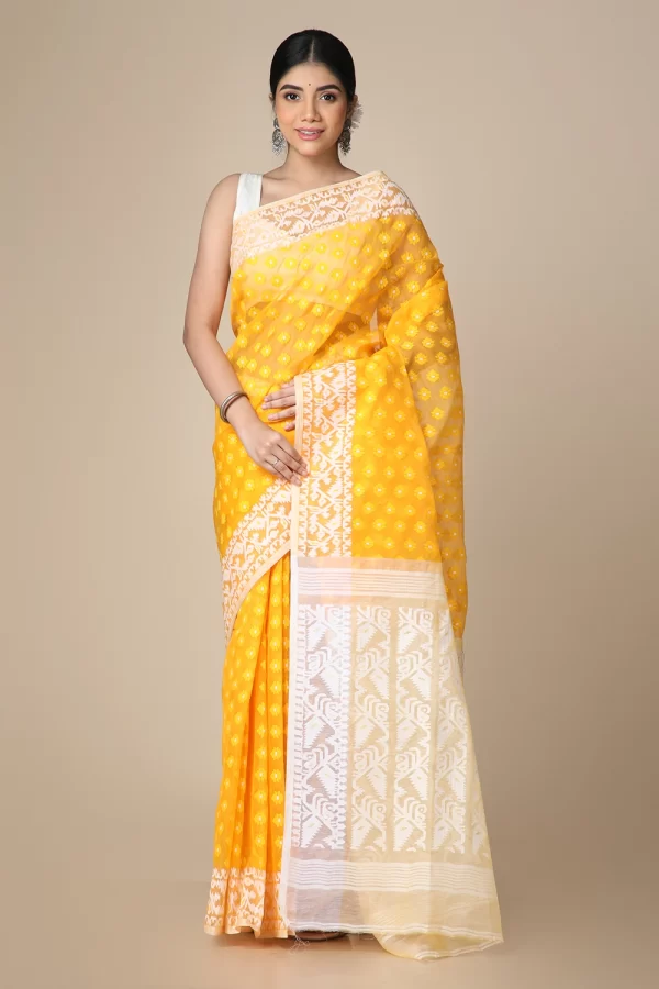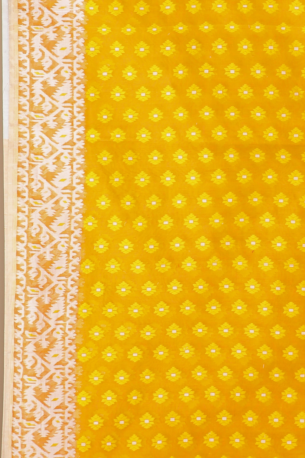 This Yellow Dhakai Jamdani Saree Is Made With A Mixture Of Cotton And Has Beautiful Contrast Jamdani Designs All Over It. This Is A Non-Hand-Woven Ethnic Artefact From West Bengal, Symbolizing The Ageless Elegance Of Tradition And Artistry. It Is The Perfect Ethnic Wear For Any Occasion. Dry Clean Only.