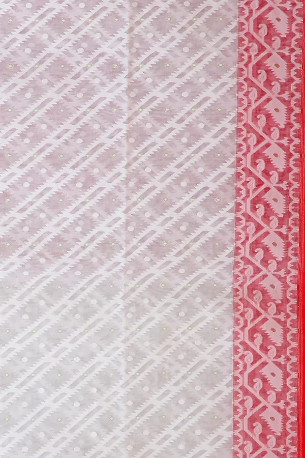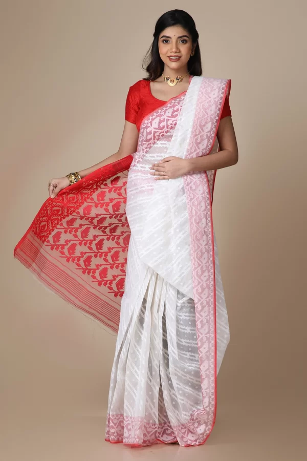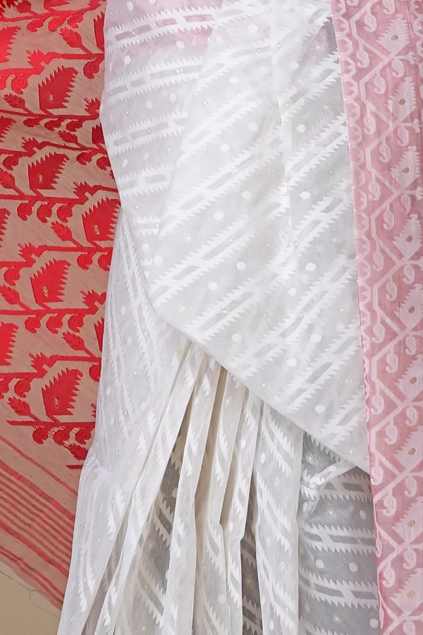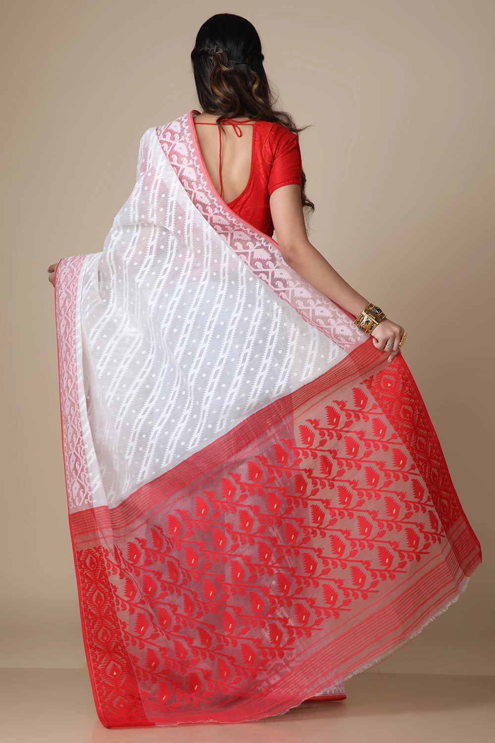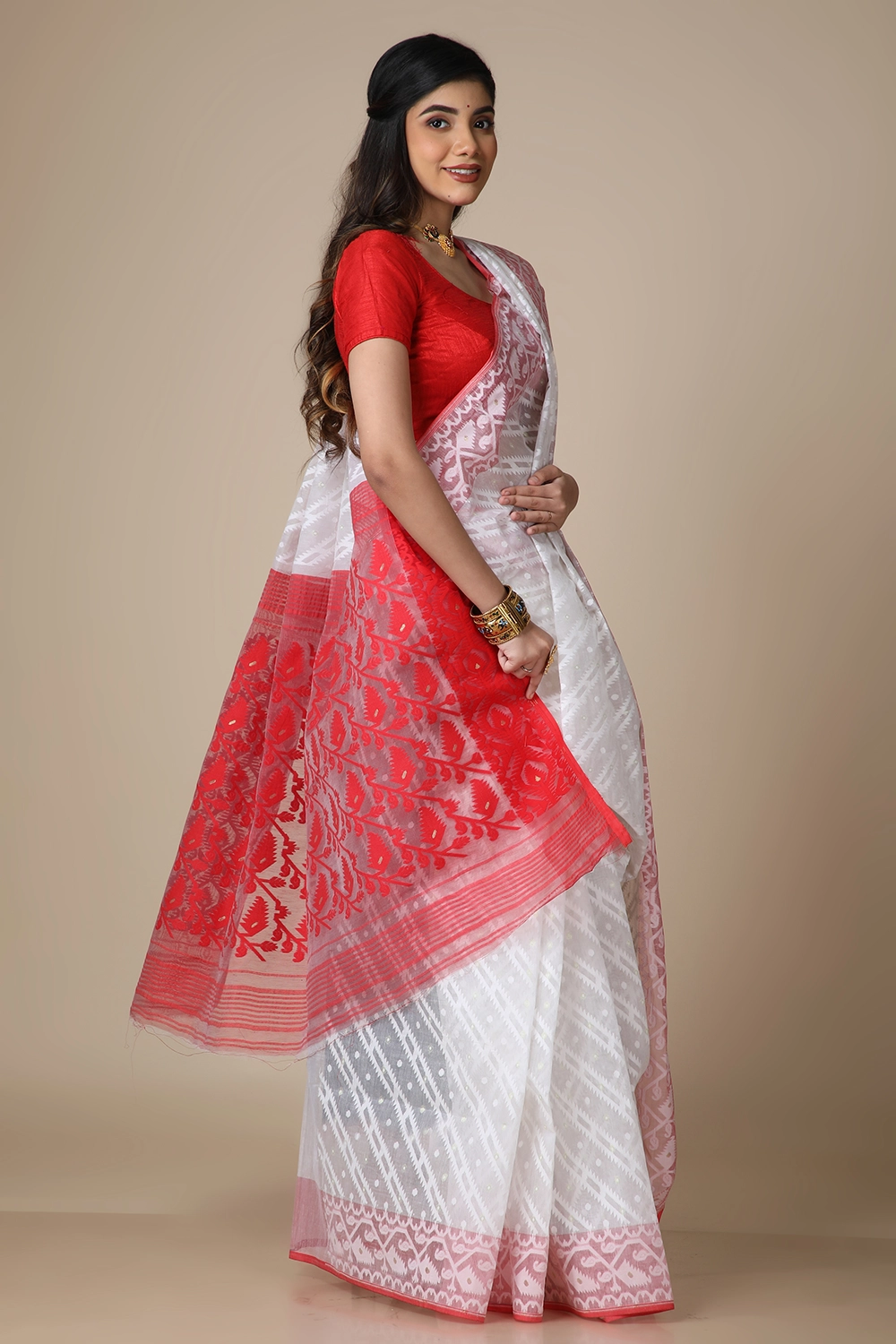 This Is A White Dhakai Jamdani Saree From West Bengal Having Karat Jamdani Artistry On Combined Cotton Fabric. In Fact, This Is One Of The Best Sarees To Add Elegance To Your Ethnic Collection. Dry Clean Only.