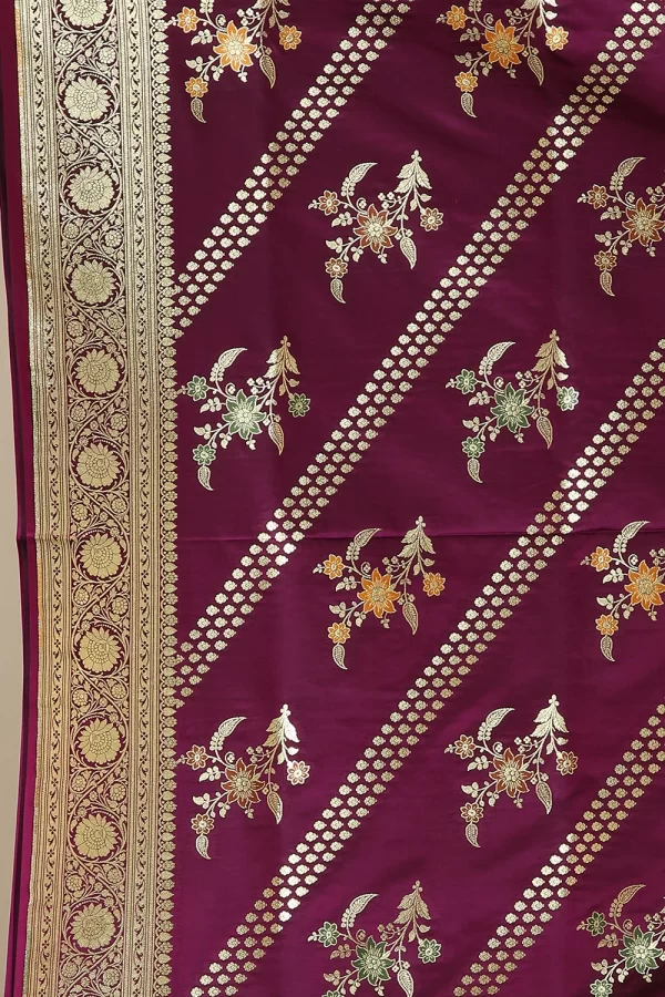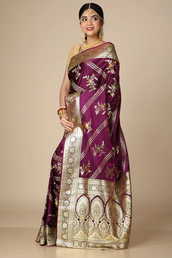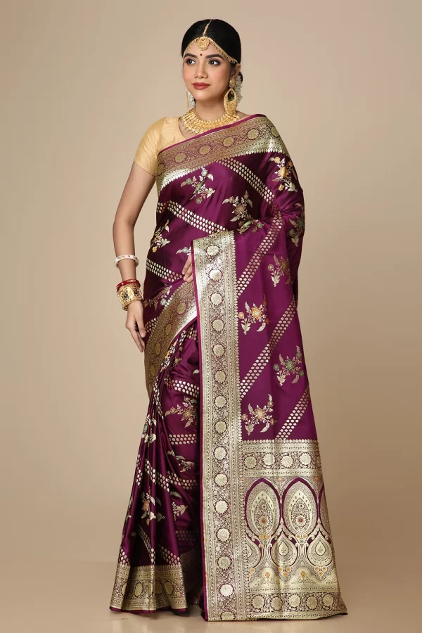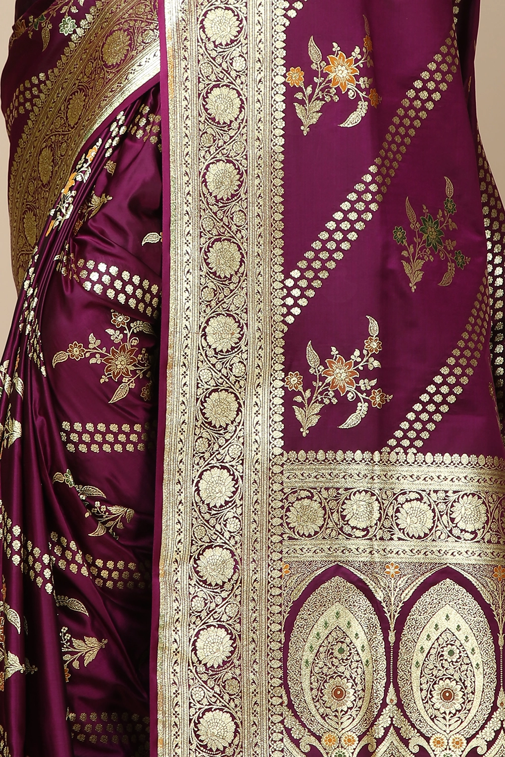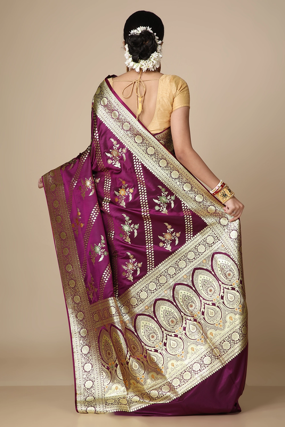 This Majestic Majenta Katan Benarasi Saree Has Gold And Silver Colours Of Resham Meena Zari Work On Blended Katan Fabric. It Is A Perfect Choice For The Bride Owing To Its Deep, Rich Colours And Fine Detailing. Handmade In Benaras, It Requires Dry Cleaning For Care And Maintenance.
