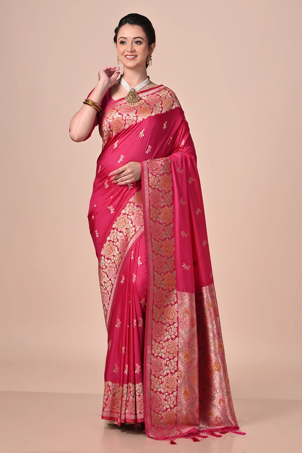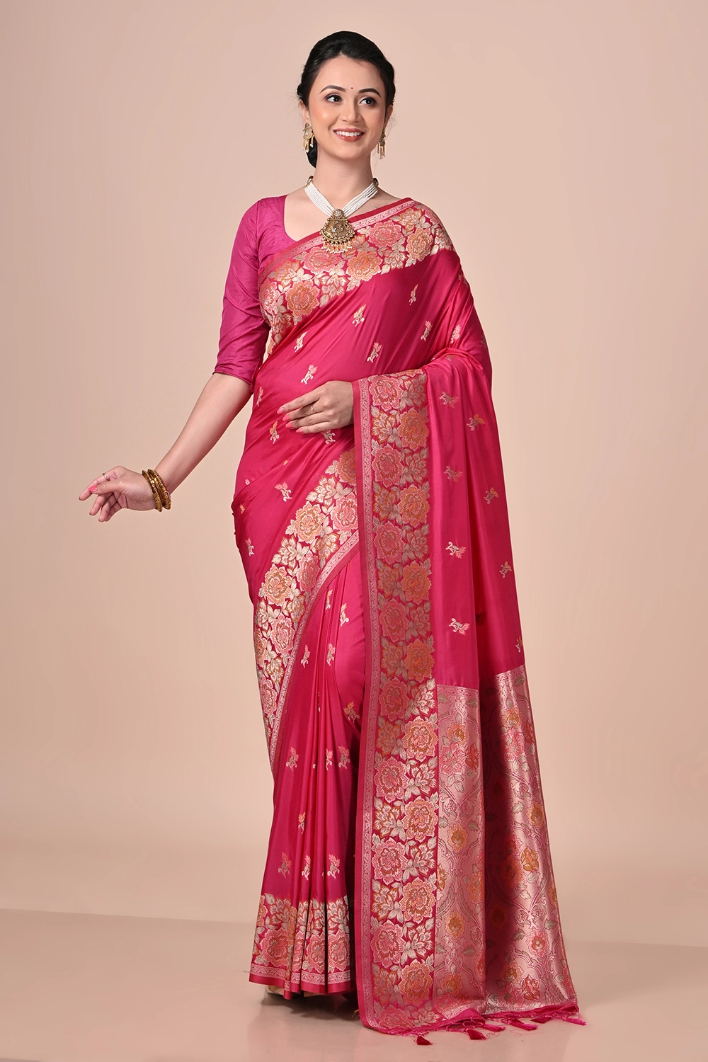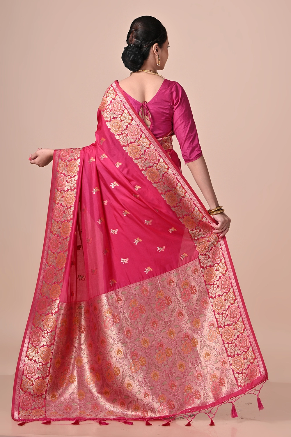 This one is the Pink Silk Saree which is made out of artificial silk. It is a mushro silk along with a Meena zari buti. A vibrant party-wear saree showcasing the South Indian weaving art of India. Dry clean only.