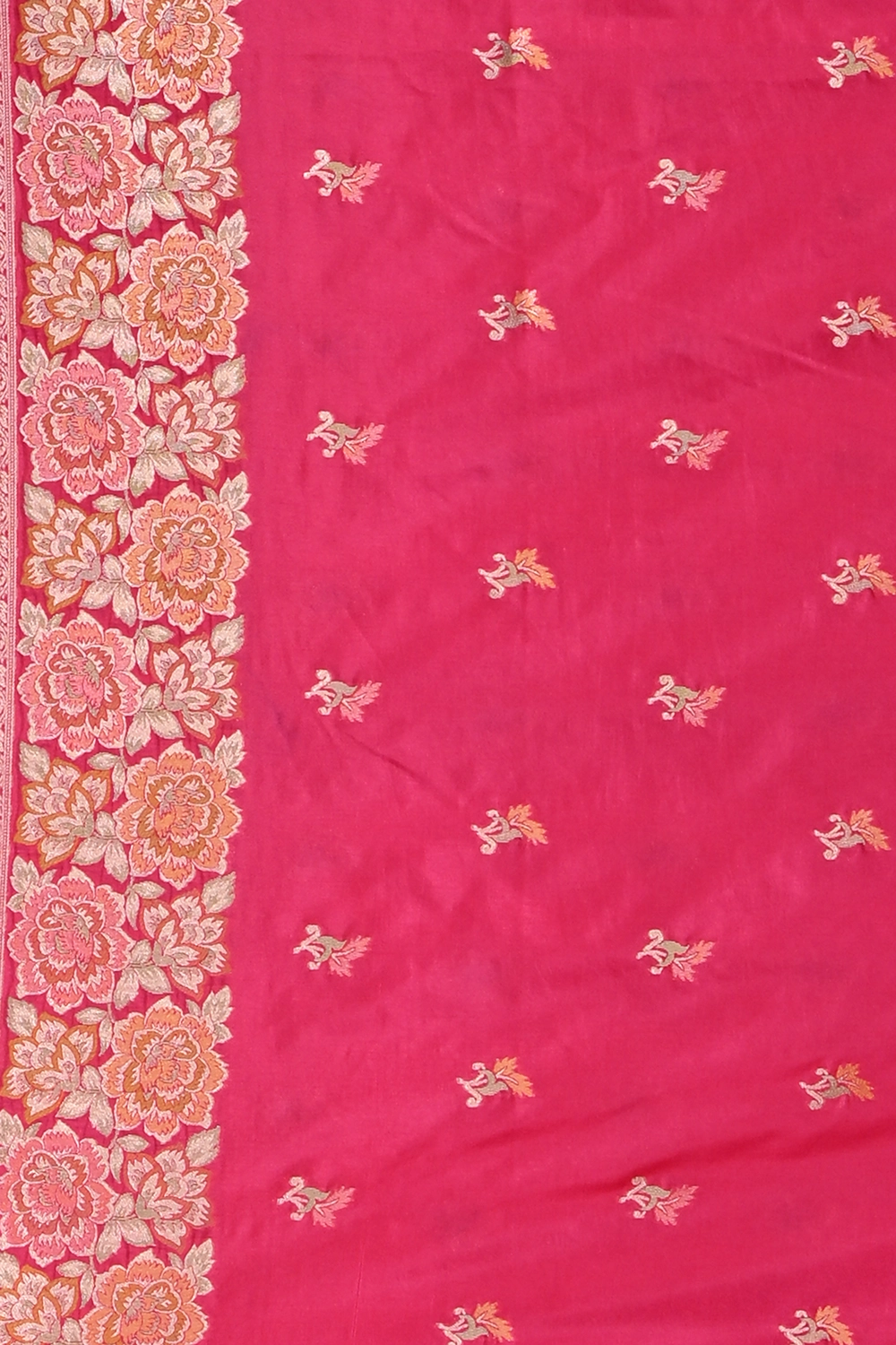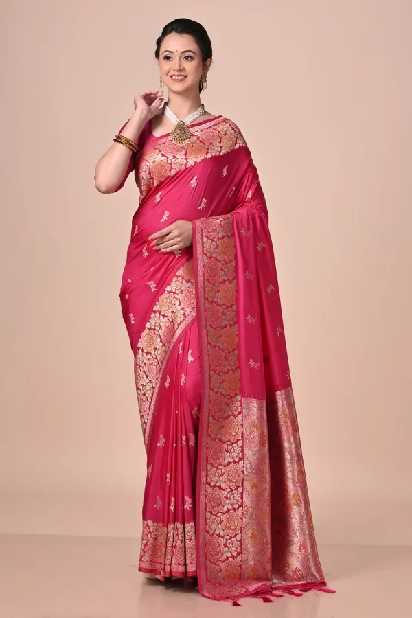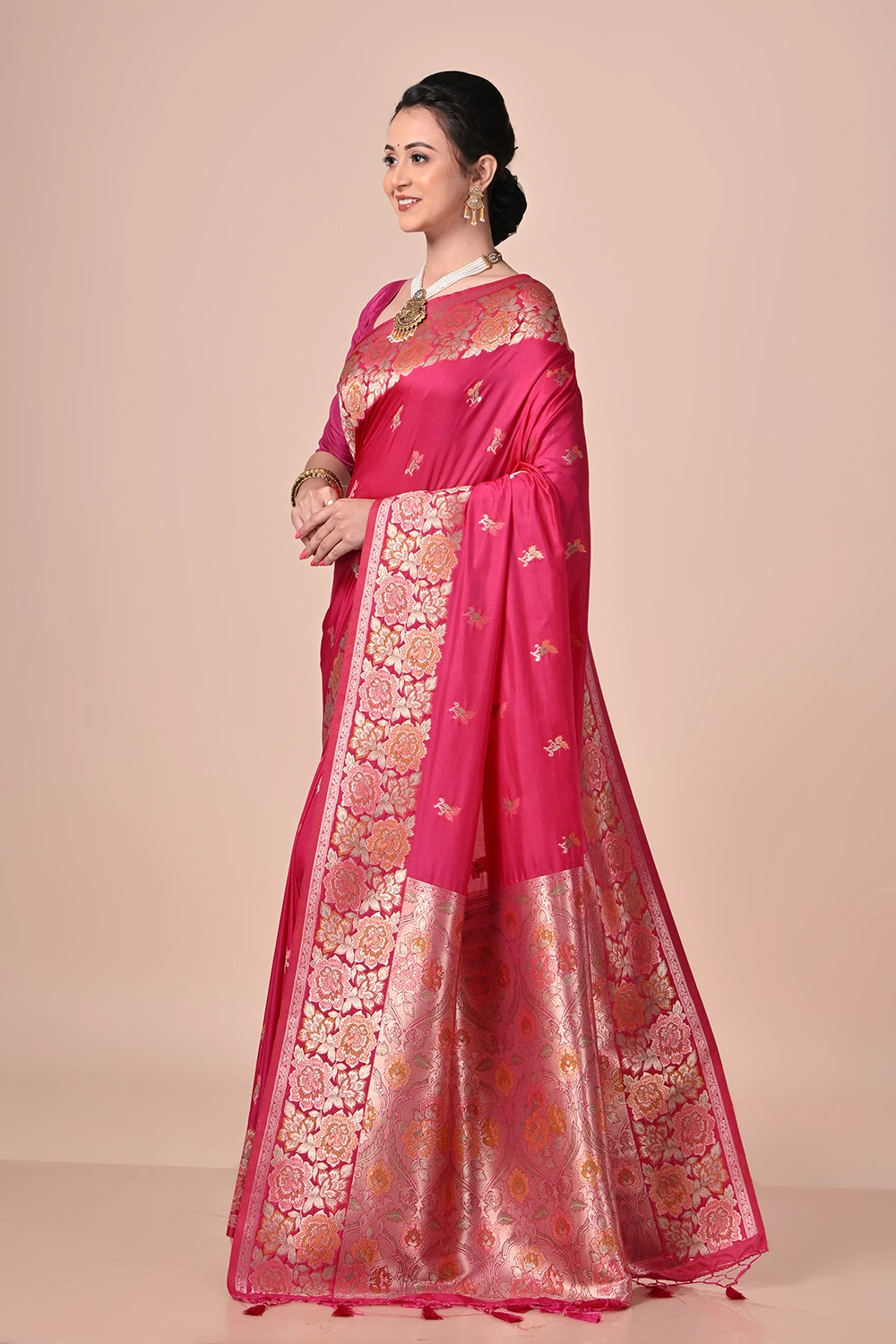 This one is the Pink Silk Saree which is made out of artificial silk. It is a mushro silk along with a Meena zari buti. A vibrant party-wear saree showcasing the South Indian weaving art of India. Dry clean only.
