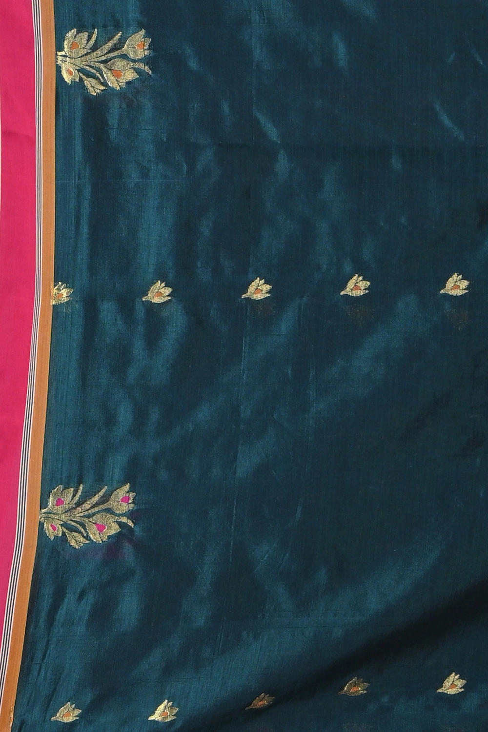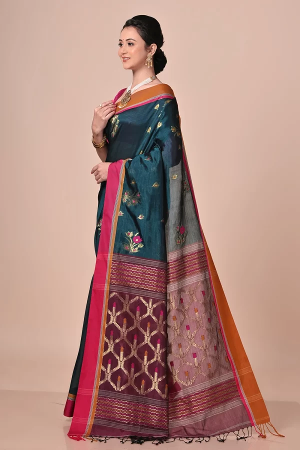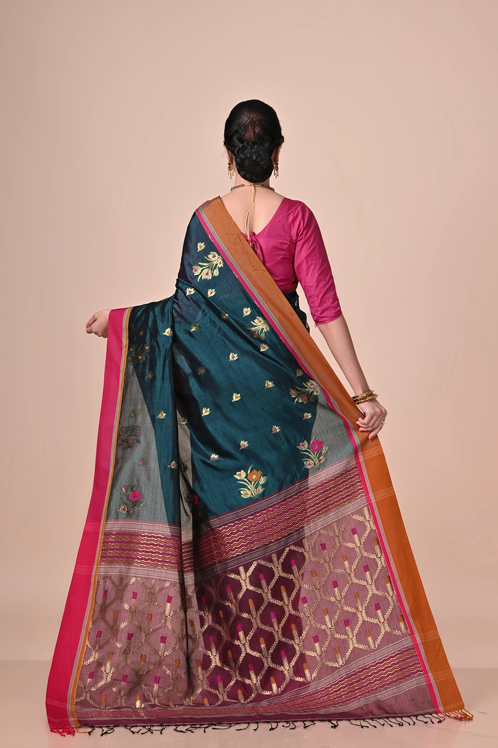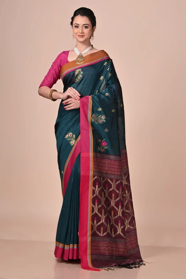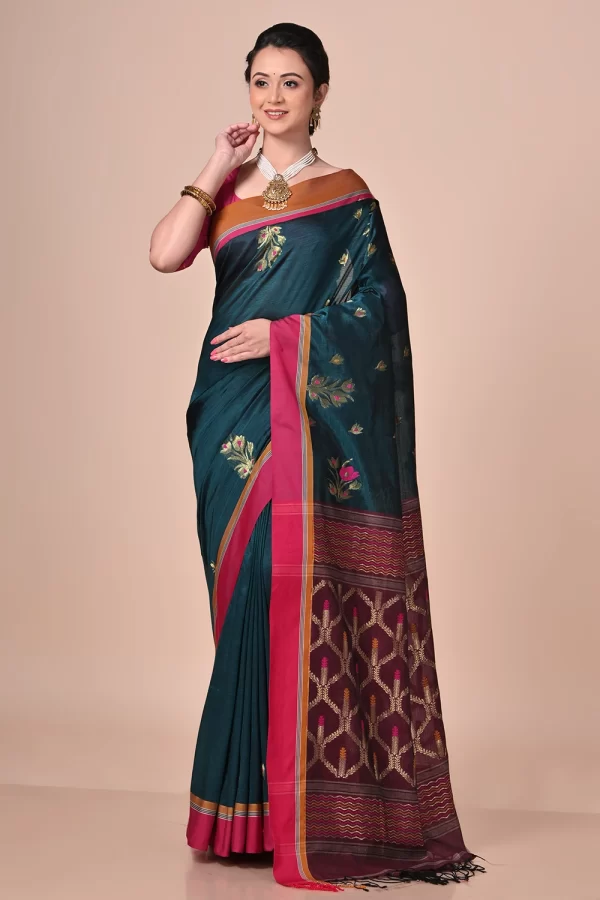 Imagining the Rama Green Handloom Saree made from high-end Raysil fabric gives an elegant vision of the person. This pure handloom silk saree from Fulia, West Bengal, sports a great contrast pallu and is meant for ethnic wear only. Dry clean only.