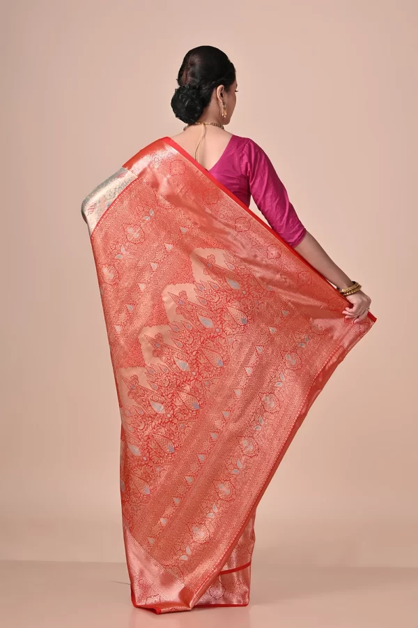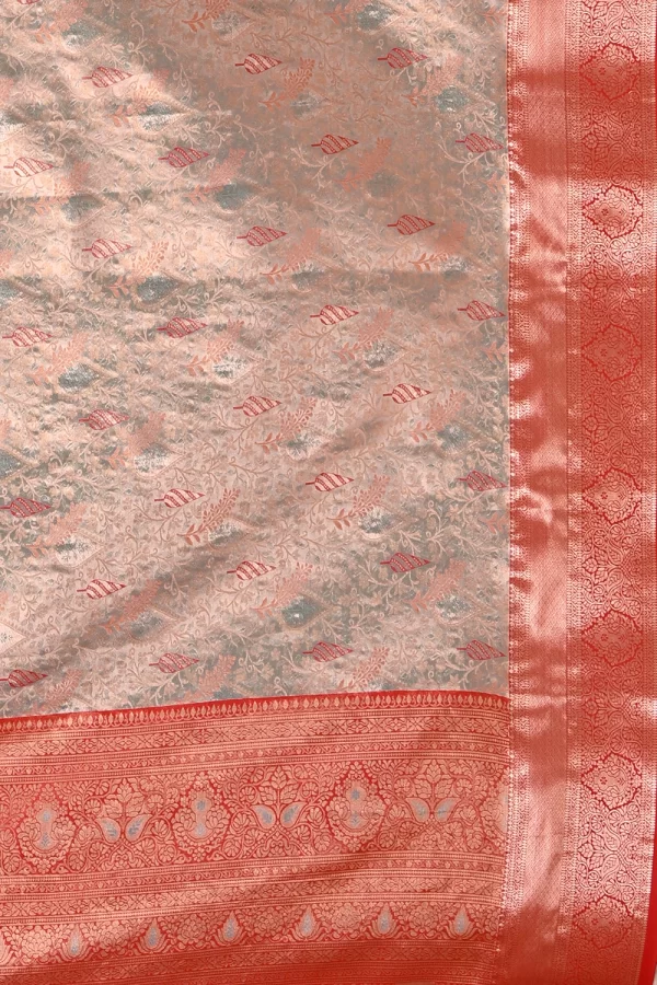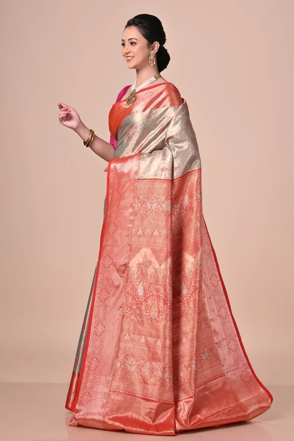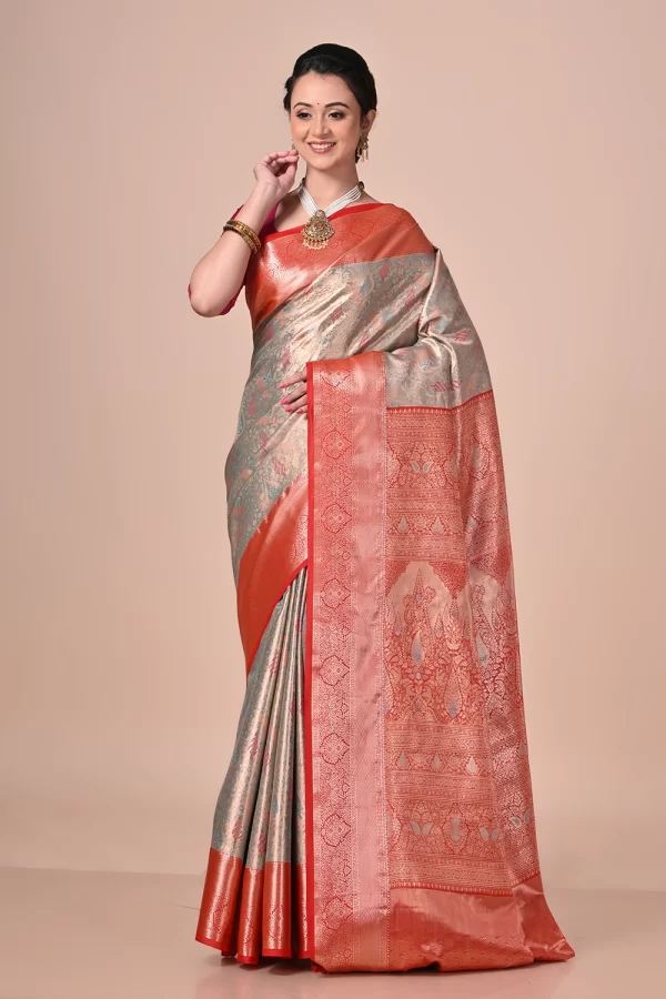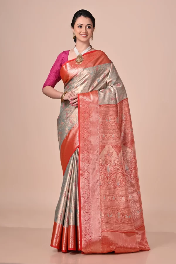 Made of blended silk, this sky blue tissue Kanchipuram saree is party wear, looking graceful. The weaving creates texture, besides having a red contrast border for elegance. Non-handwoven; requires dry cleaning.