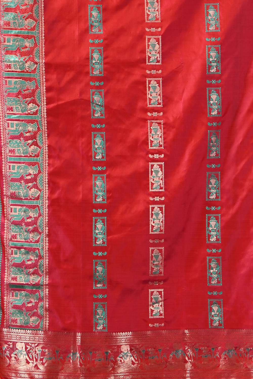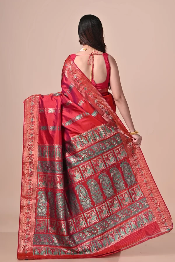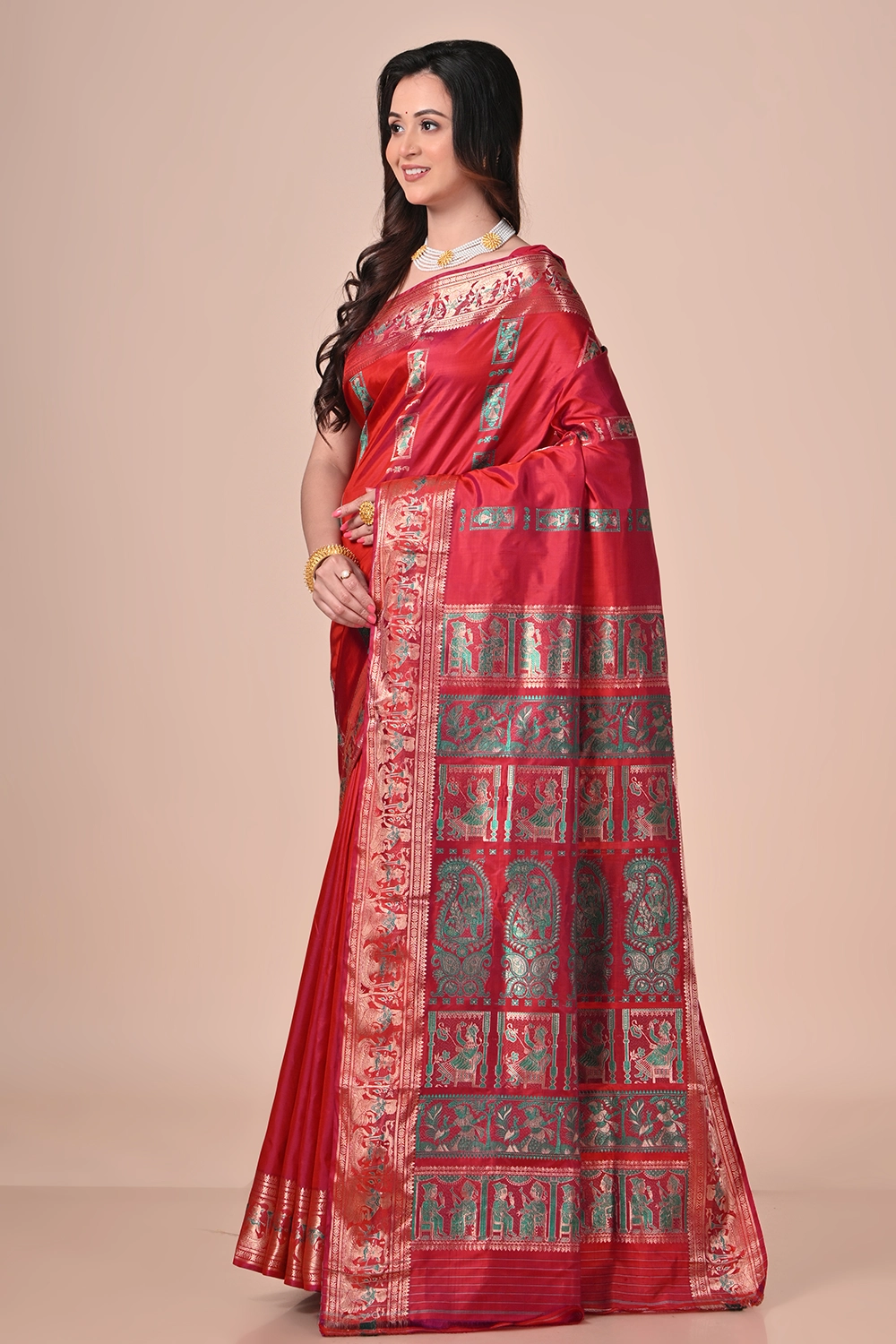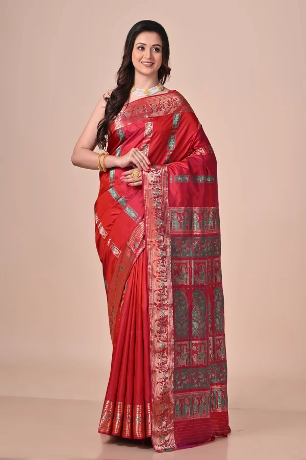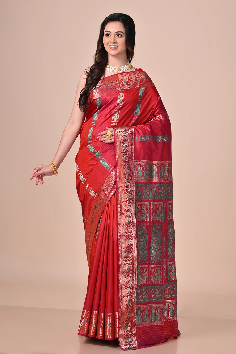 Dual Tone Swarnachuri Saree Pure Silk Rani & Majenta. An exemplary handloom creation from Bankura, Bishnupur is best for party time with Box Meena Buti and Swarnachuri design. Dry clean only.
