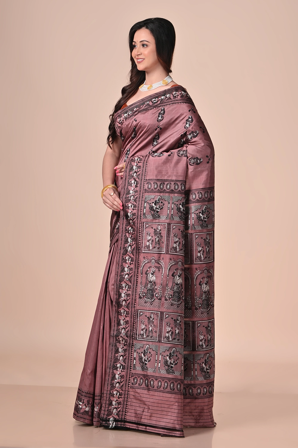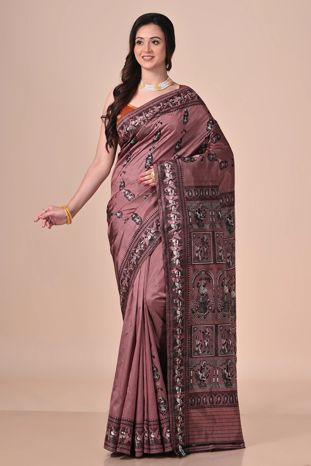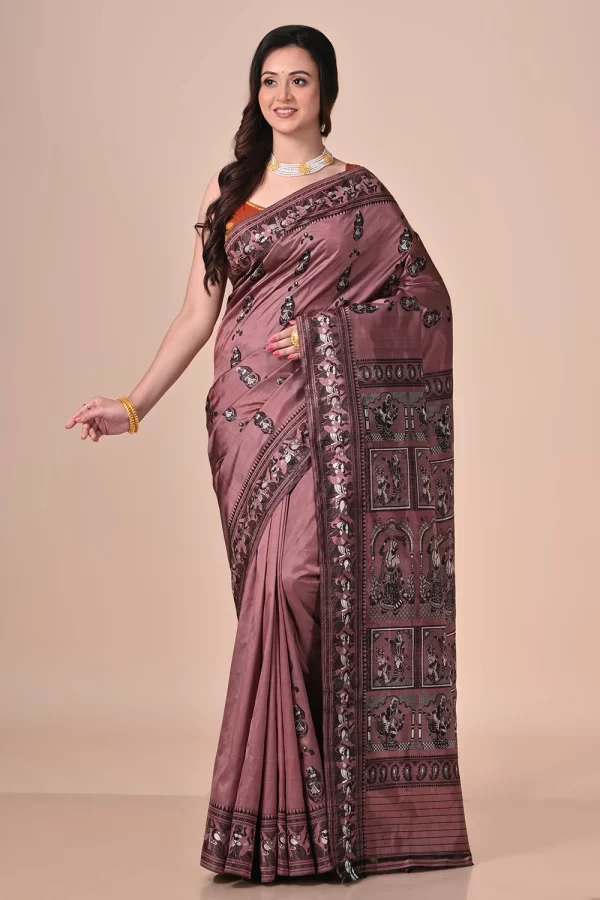Depicting Elegance?This dusky peach Baluchari saree is made of pure silk. Hand-woven in Bankura, Bishnupur; adorned with graceful resham Meena Buti: for an ideal party. Dry clean only.