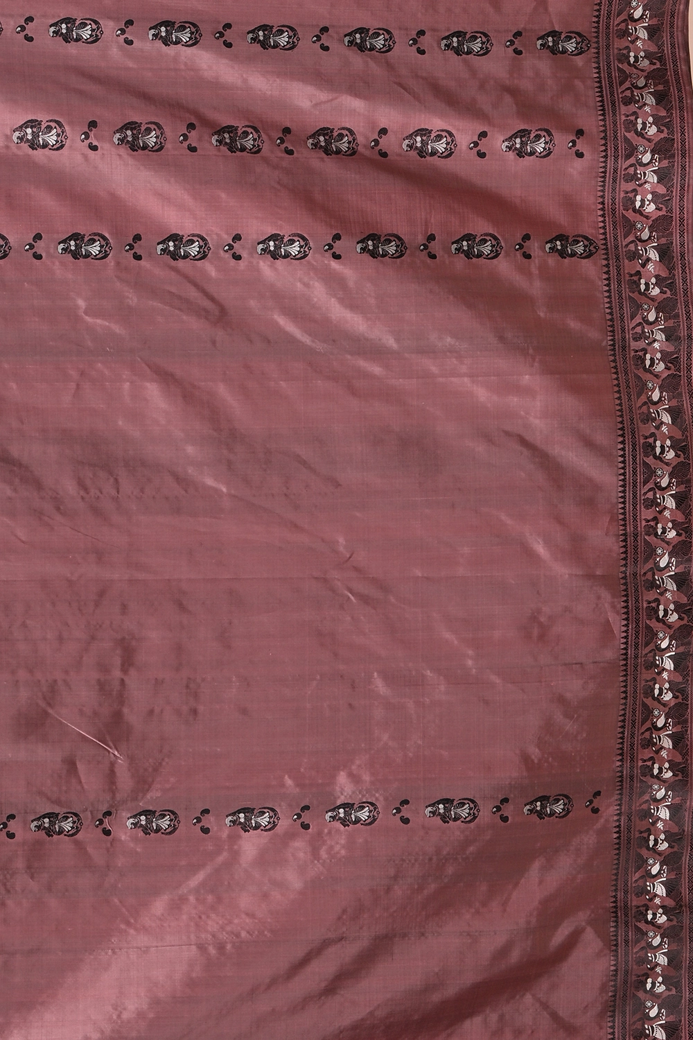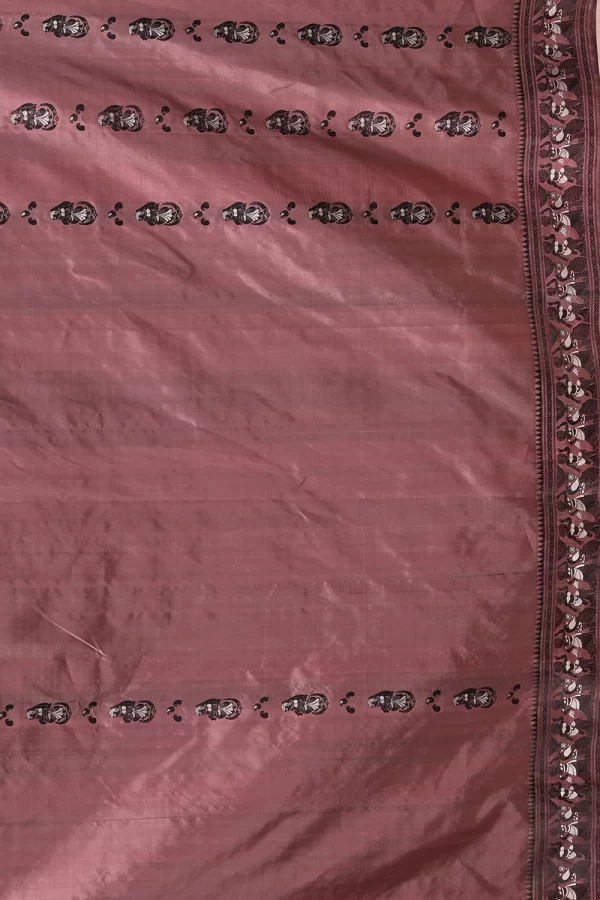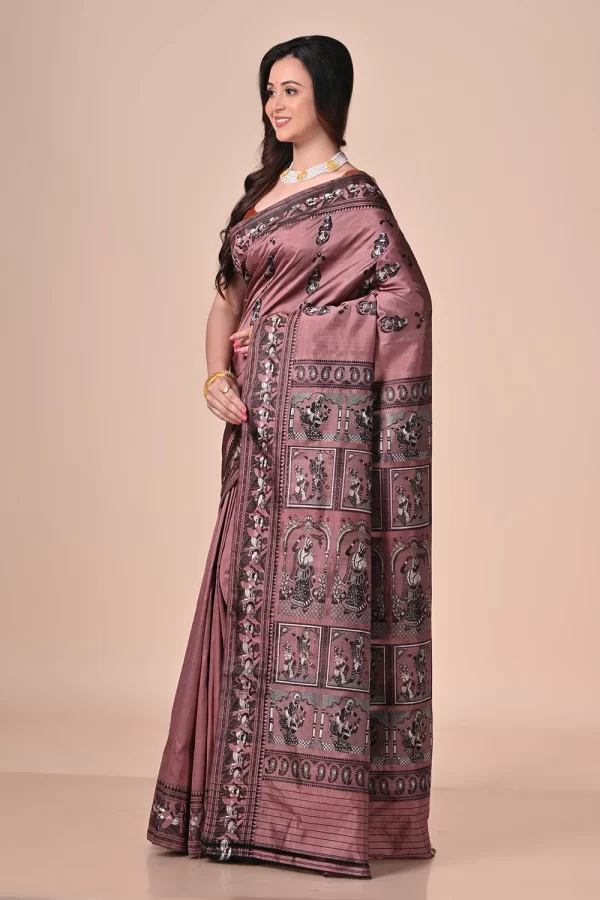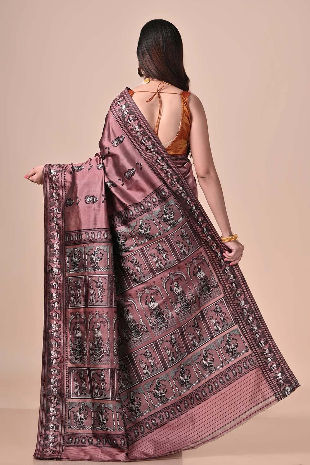 Depicting Elegance?This dusky peach Baluchari saree is made of pure silk. Hand-woven in Bankura, Bishnupur; adorned with graceful resham Meena Buti: for an ideal party. Dry clean only.