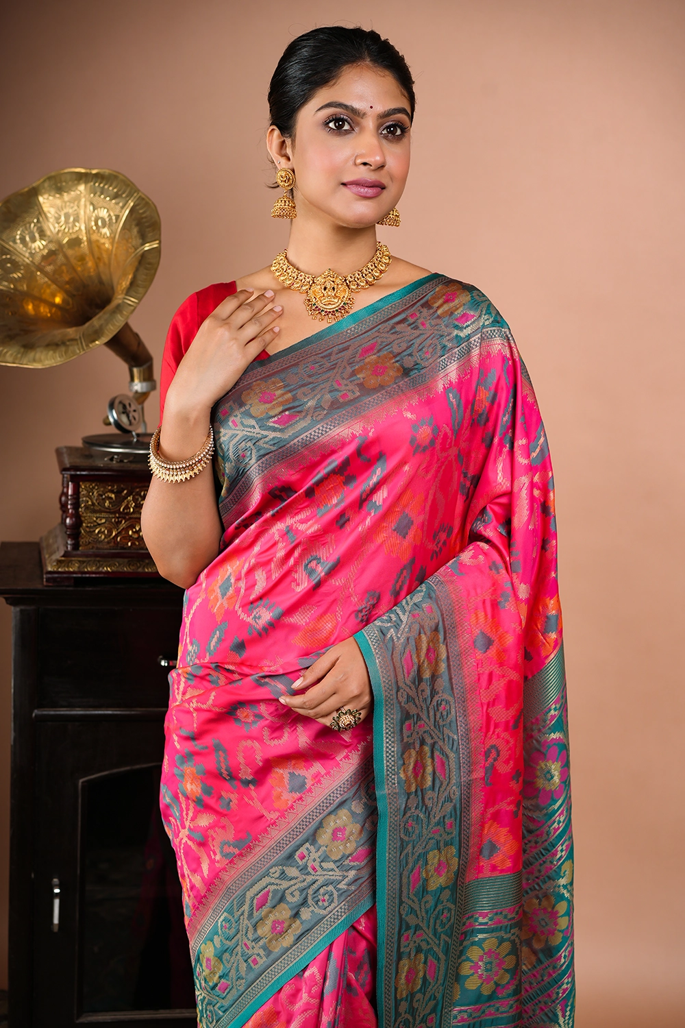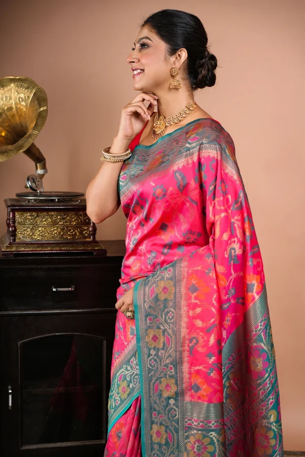 Pinkish Red Katan Pochampally Saree