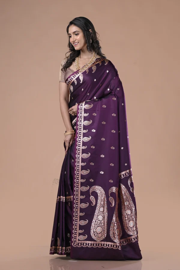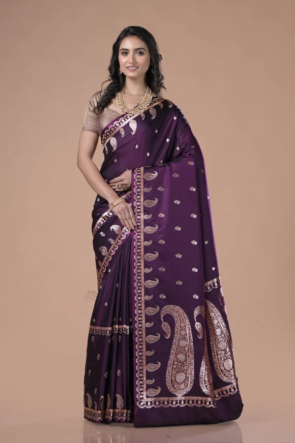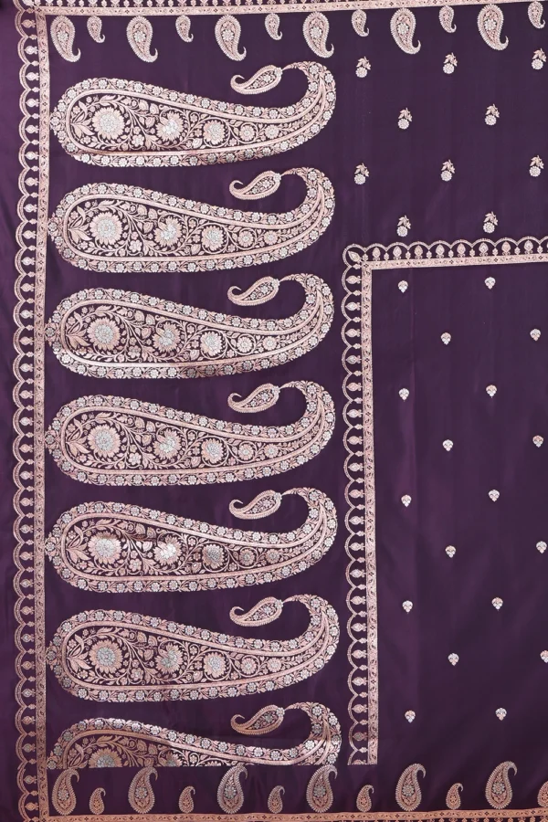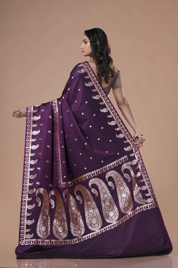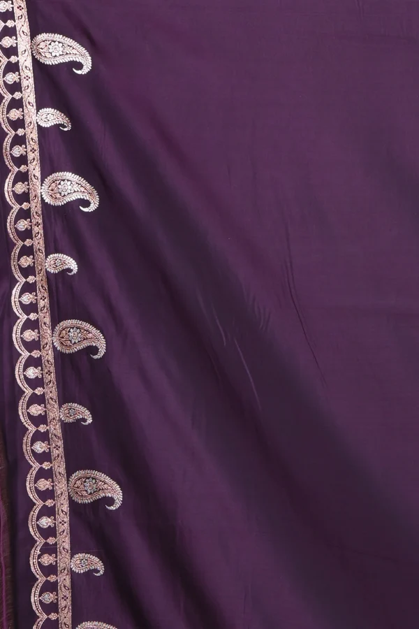 Dark Purple Mashru Silk Saree is crafted from Mashru silk, showcasing its classic aesthetics. The satin silk of the saree makes you feel highly comfortable against your skin and offers silky shine. Its lustrous surface reflects light while creating soft drapes. The border designs and sparkling woven motifs add depth to the dark purple color of the saree. This saree also has a blouse piece attached to it, making it the best choice for grand parties. Get a complete look by wearing golden jewelry and making your presence unforgettable.