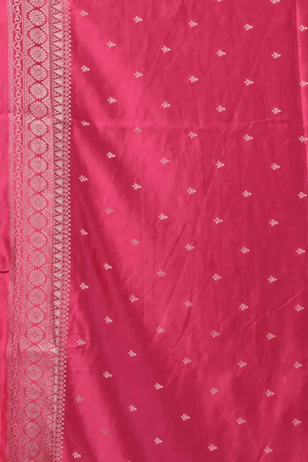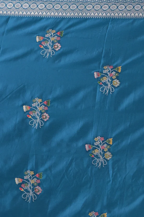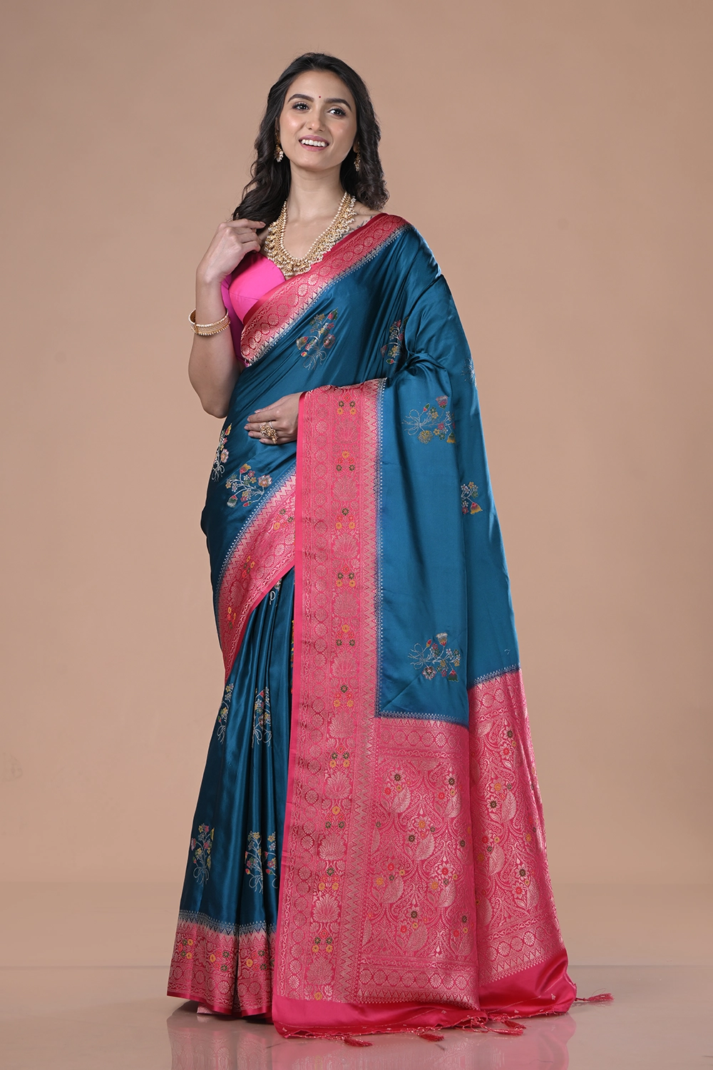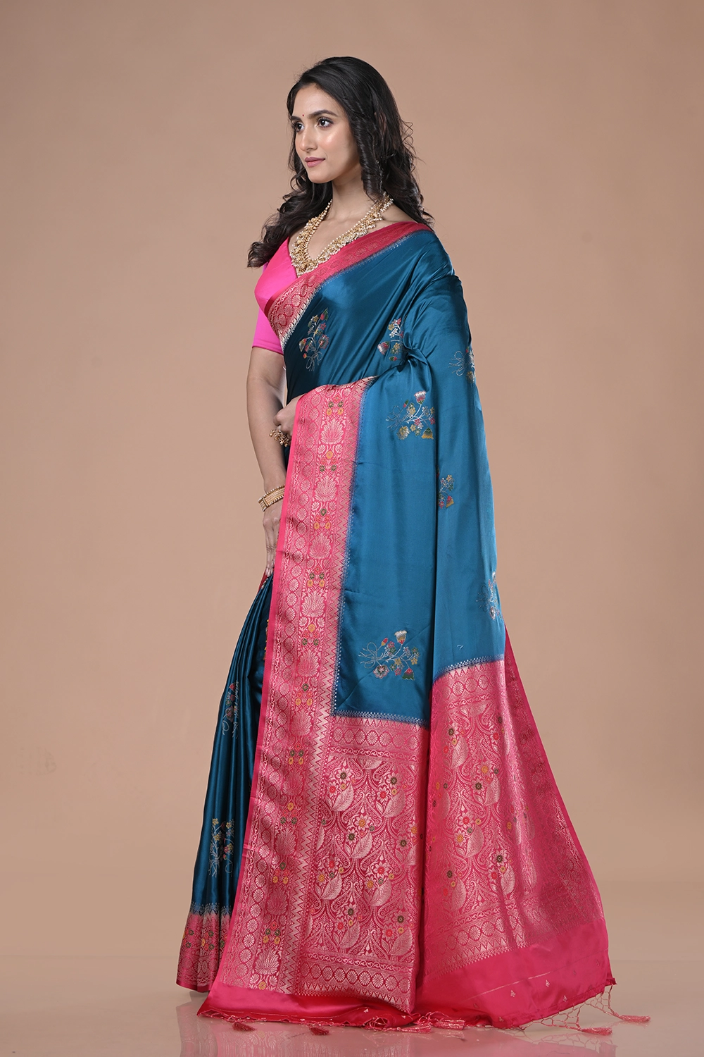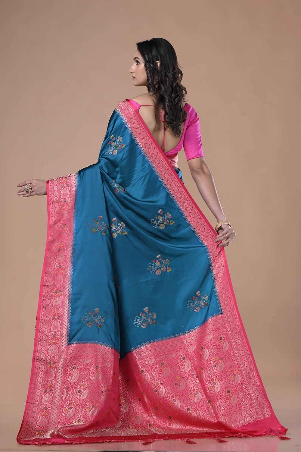 Wrap yourself in the brand new Deep Blue Mashru Silk Saree from Priya Gopal Bishoyi. The saree has a beautiful combination of blue and pink, displaying its enduring appeal. The saree is manufactured using a blended Silk saree, creating a lustrous shine on the saree. The saree also consists of contrast Meena work on the dark blue base, making it an ideal party wear. Make a perfect fashion statement by pairing it up with beautiful golden jewelry.