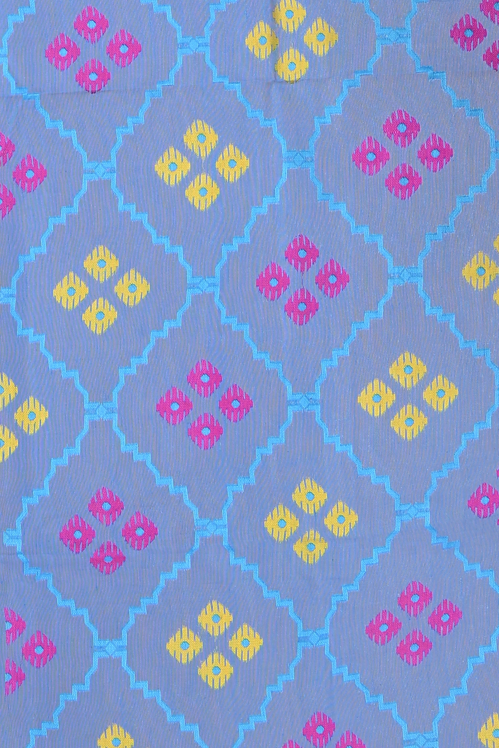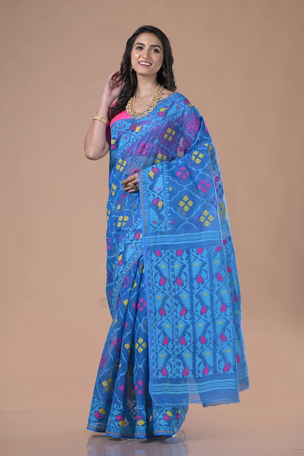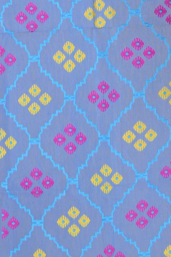 Explore the new and vibrant Azure Blue Dhakai Jamdani Saree. The saree is made from blended cotton fabric, making it comfortable against your skin with Meenakari work detailing on the surface. Flaunt your ethnic style by wearing it at a small party or evening celebration, displaying exclusive textile heritage. Make a classic fashion statement by pairing it with a matching blouse piece attached to the saree, blended with the goodness of Bengal culture.