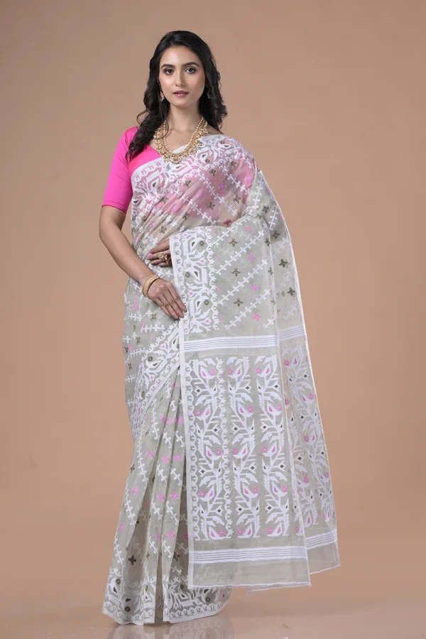Fill your collection with the new Light Gray Dhakai Jamdani Saree from Priya Gopal Bishoyi. The saree is made from blended cotton, making you feel comfortable against your skin. The serene light gray base consists of beautiful Meena Jal Work, making it an ideal choice for ethic events and small gatherings. The saree also consists of charming white, pink, and dark grey designs imprinted on it. Complete your traditional look by pairing the saree with vibrant, golden accessories and make a perfect fashion statement.