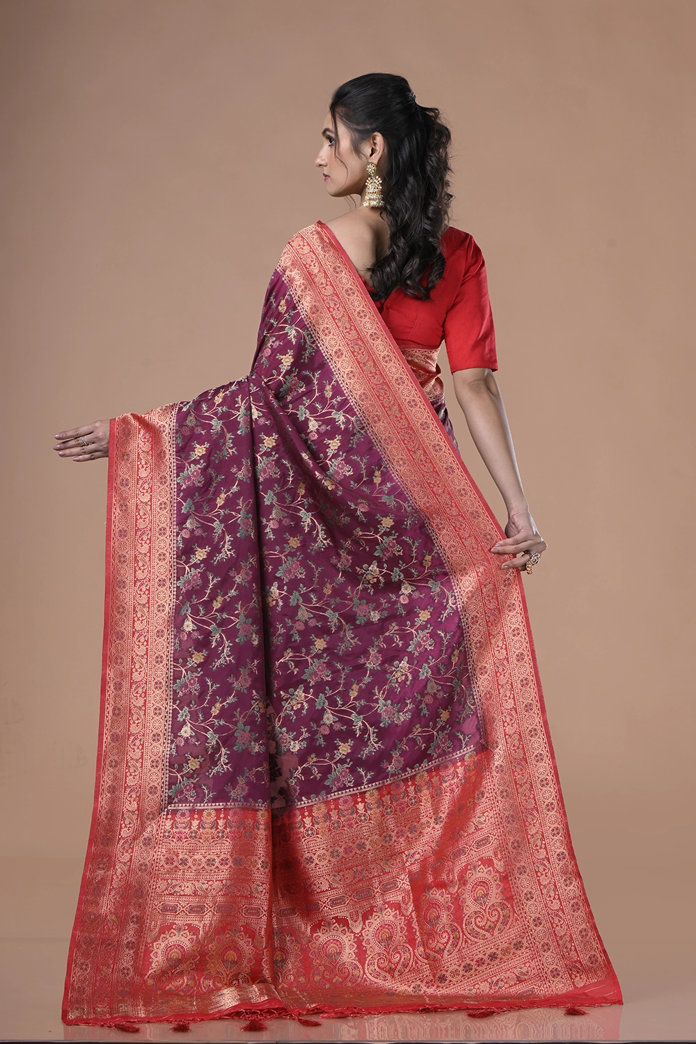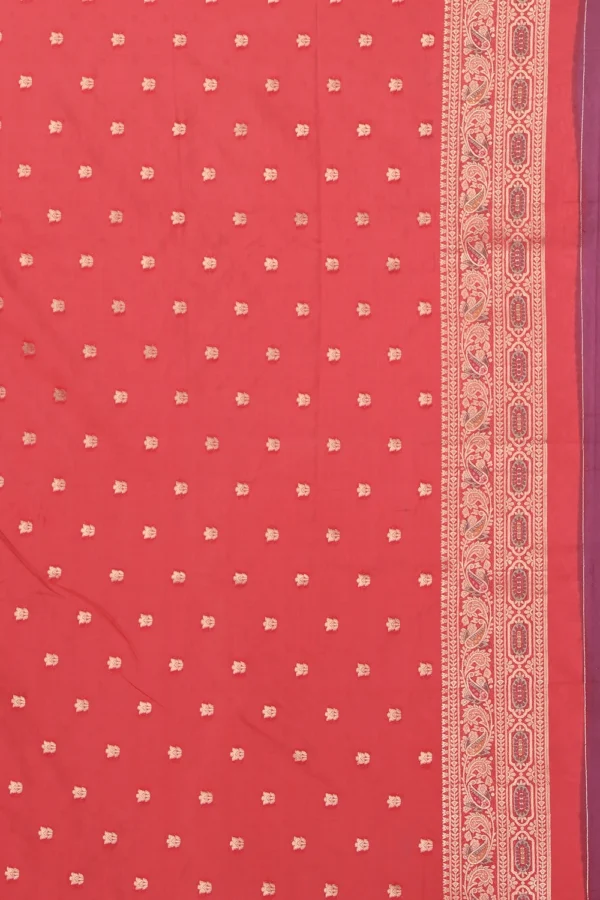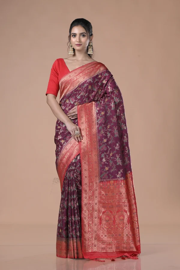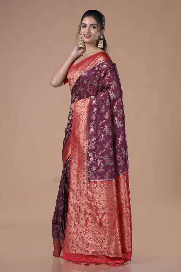 Pick the new Dark Magenta Semi Muslin Saree for yourself and showcase your sophisticated look. The saree is manufactured using blended Muslin fabric, with Meena Contrast Jal work crafted on the vibrant dark magenta surface. The saree also consists of a shiny red pallu and border, making it an excellent choice for parties, festivals, and weddings. Complete your party look by wearing it with a matching color blouse piece attached to it. You can also create an iconic fashion statement by pairing it with minimal golden jewelry, making your presence unforgettable.