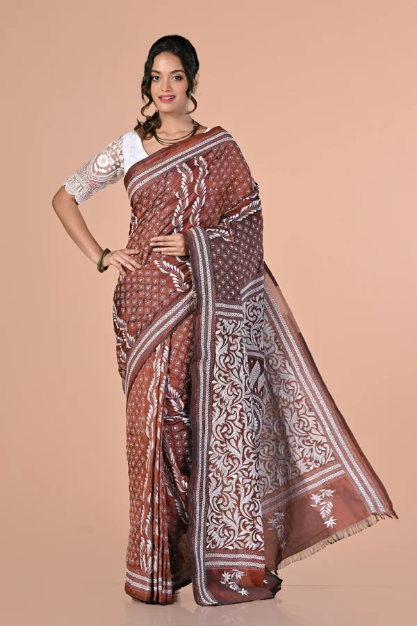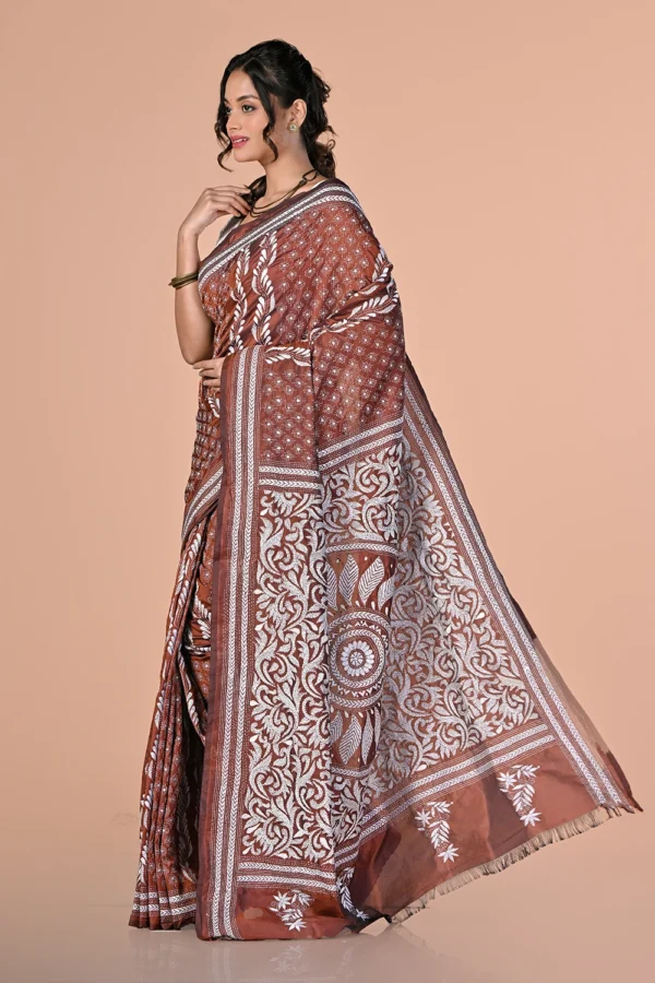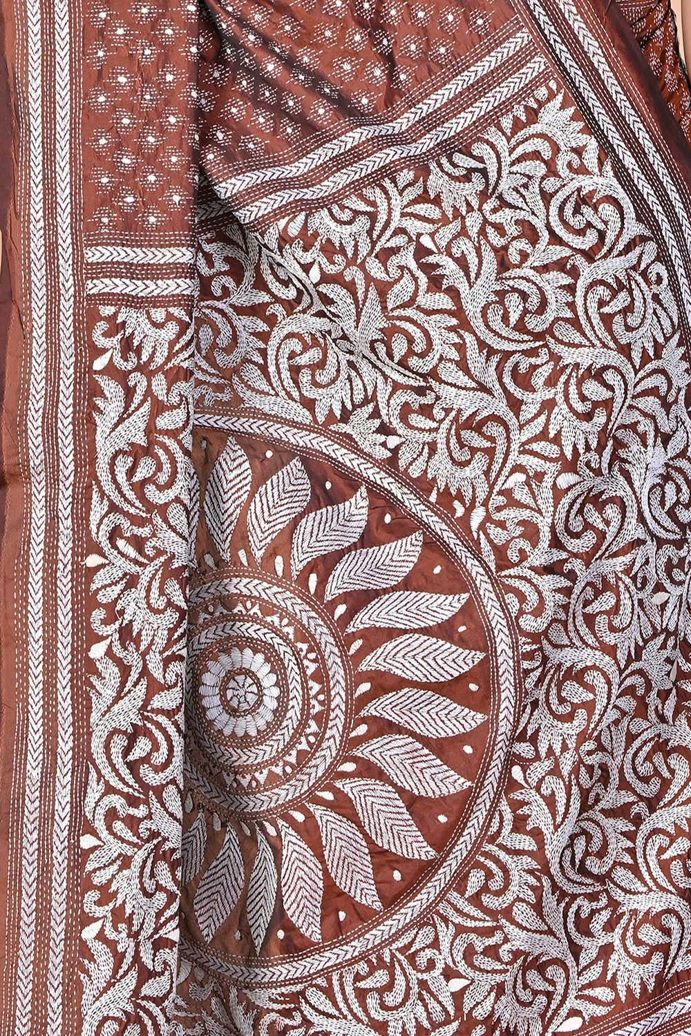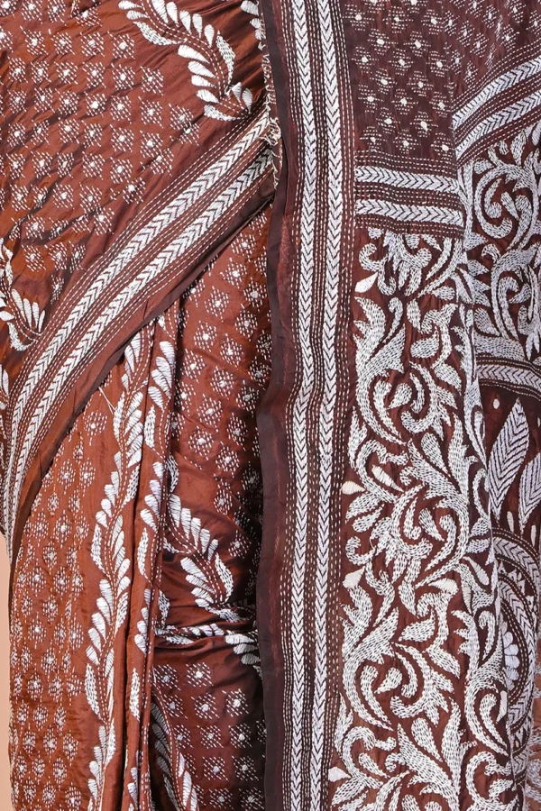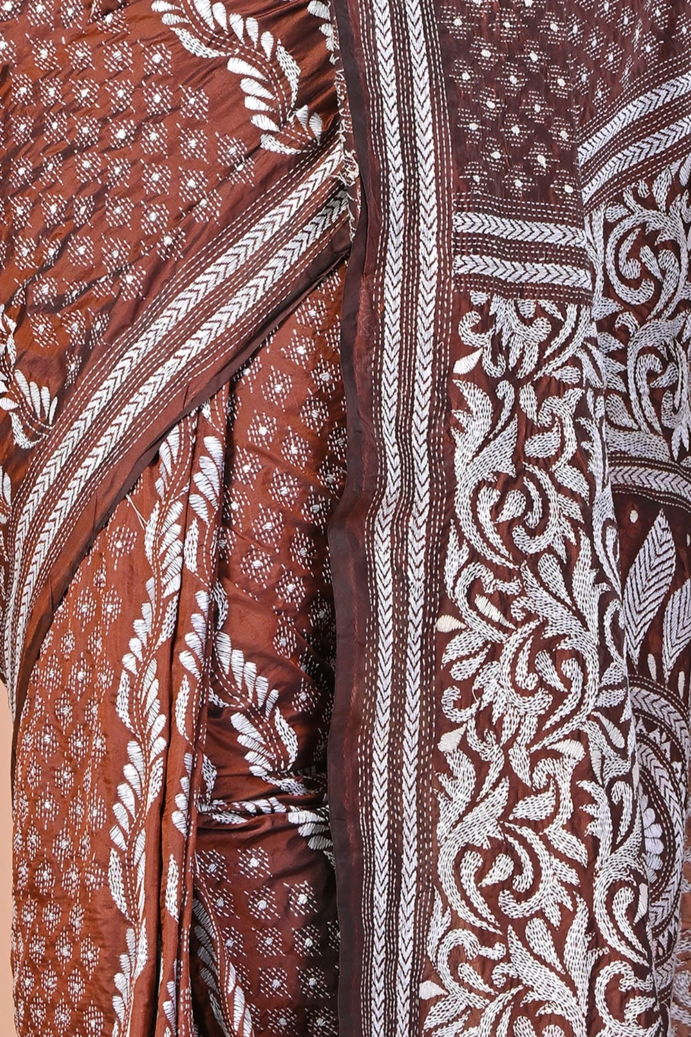 Add the Rust Brown Kantha Stitch Saree to your wardrobe. The rush brown surface of the saree is covered with hand embroidery design, showcasing the exclusive tradition of Shantiniketan. The saree is made using blended silk, creating perfect drapes and an excellent choice for regular wear. You go to office events, outings with friends, and small parties. You can also find a matching color blouse piece attached to the saree, allowing you to select the neck design of your own choice.