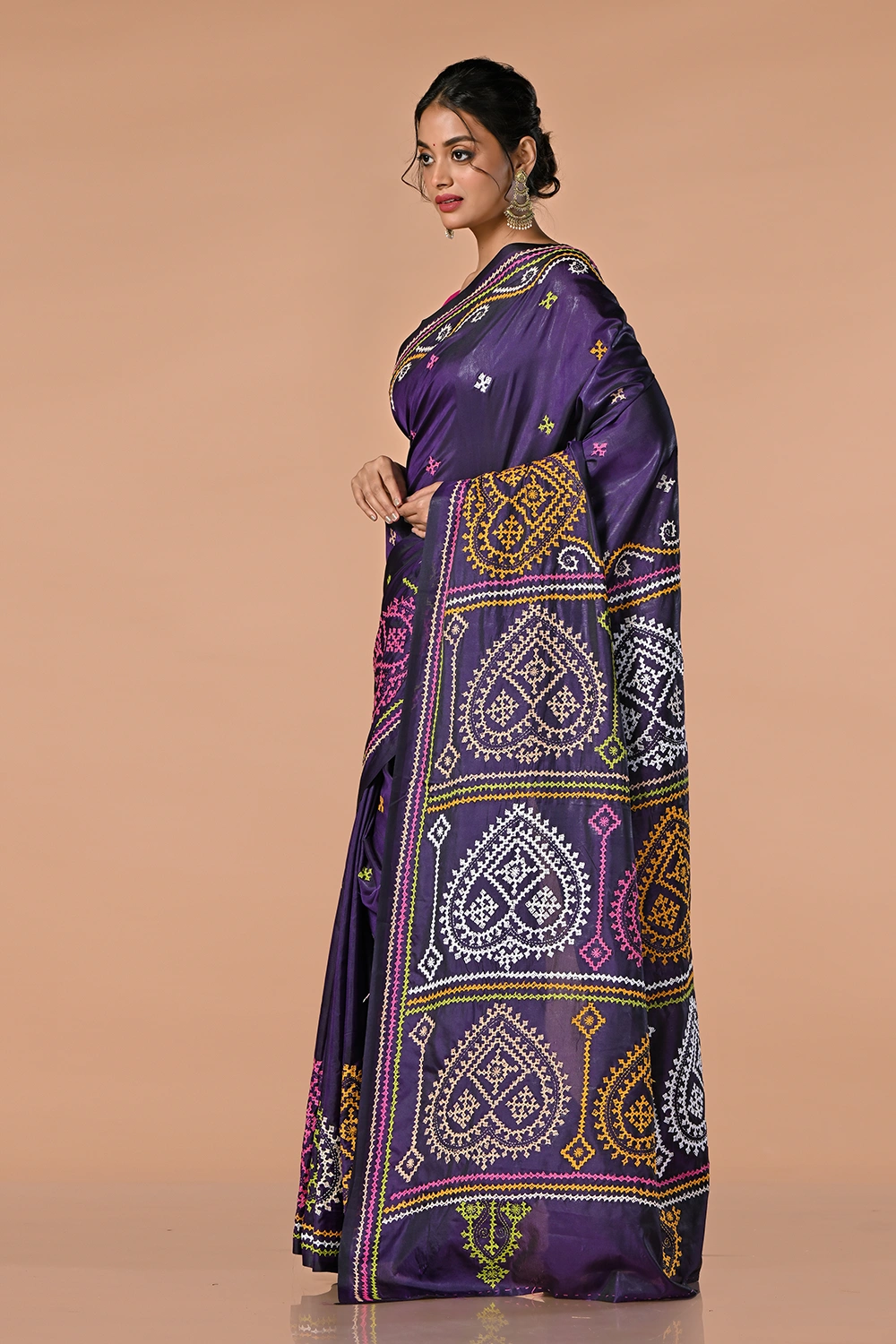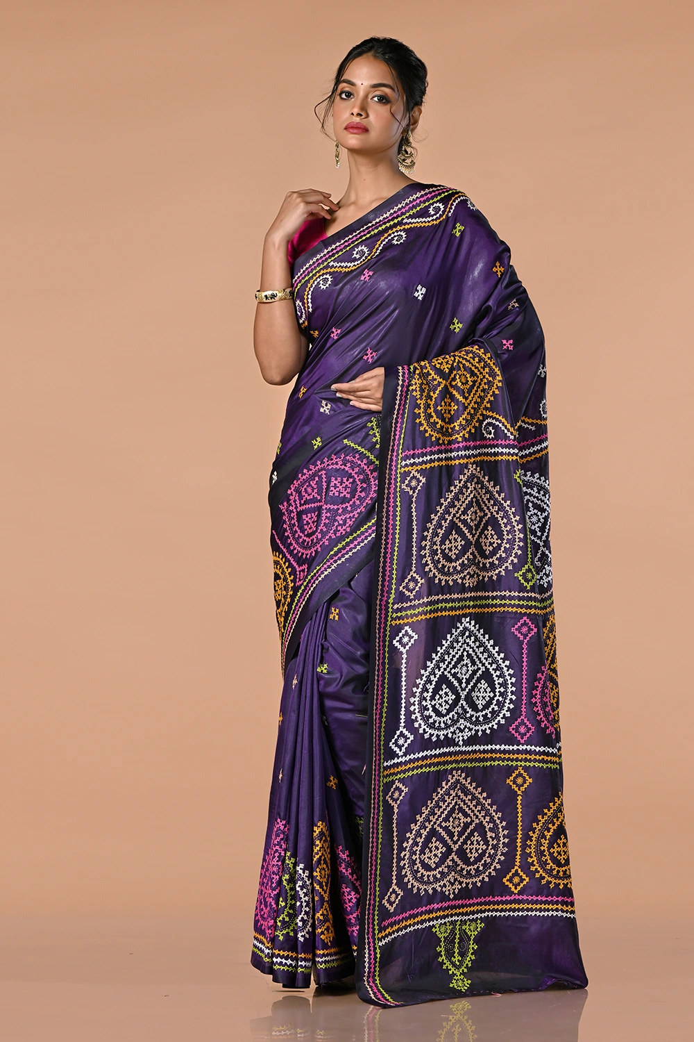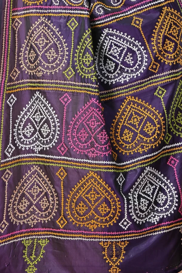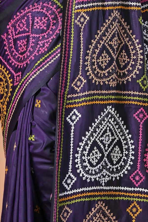 Deep Purple Kantha Stitch Saree