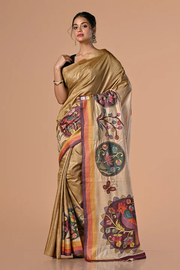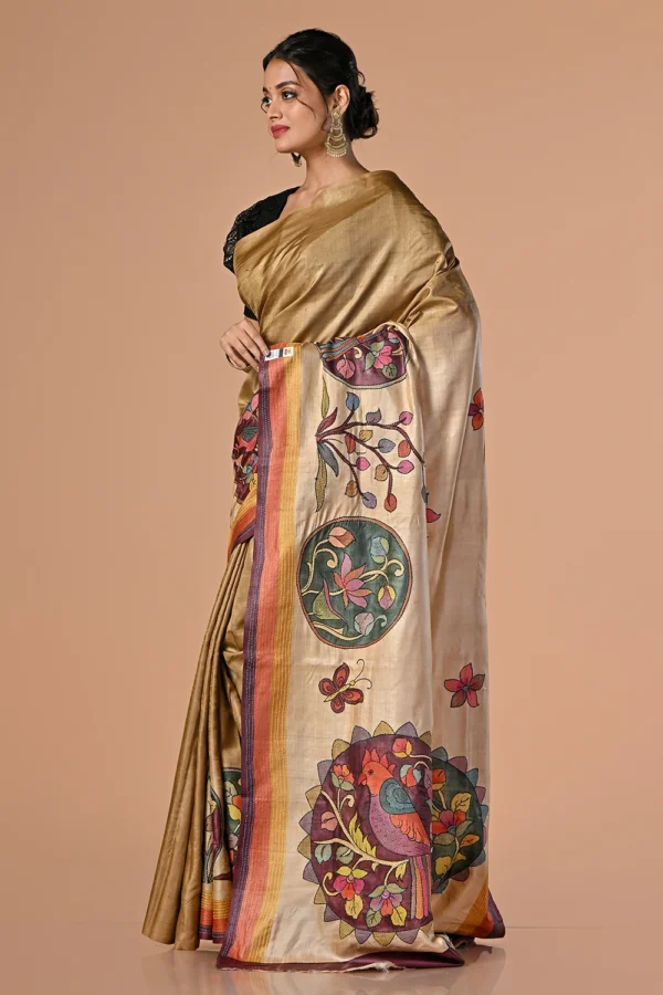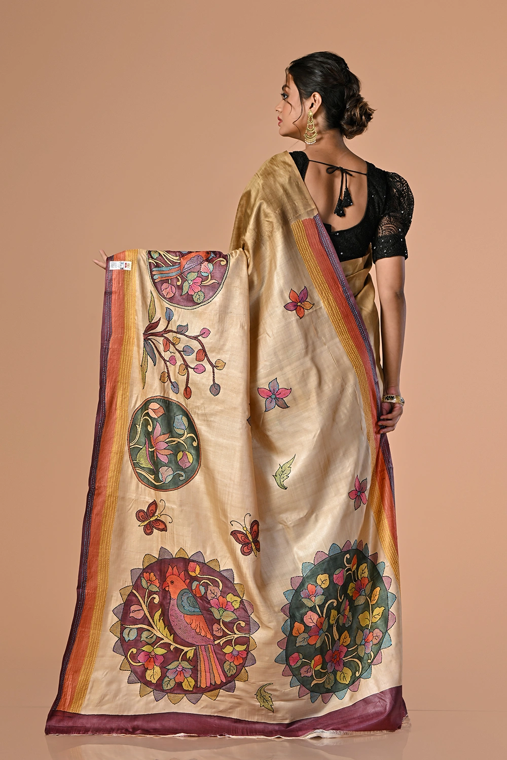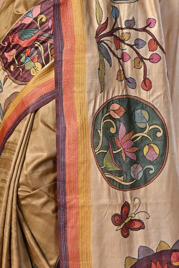 Brownish Beige Pure Tussar Kantha Stitch Saree