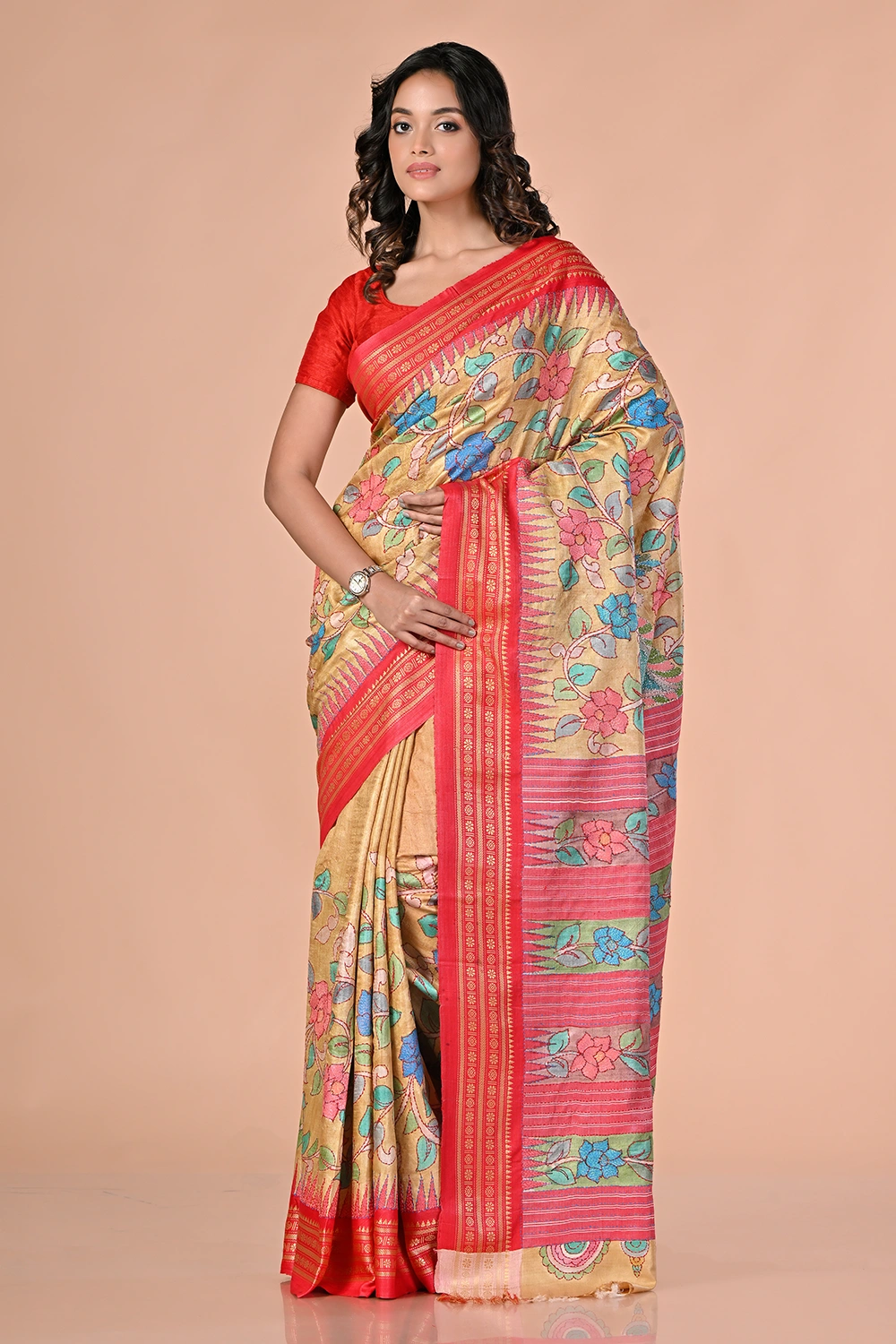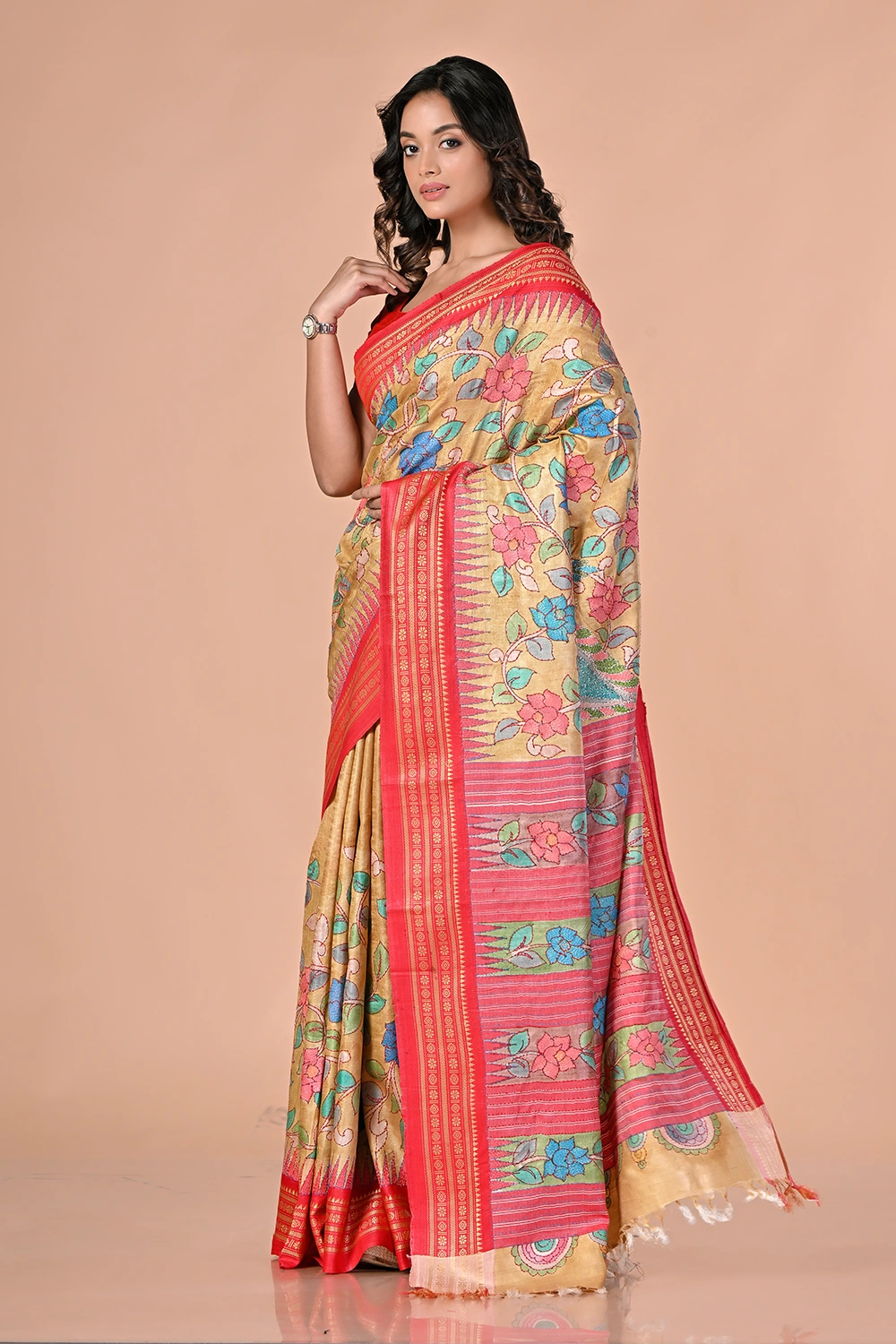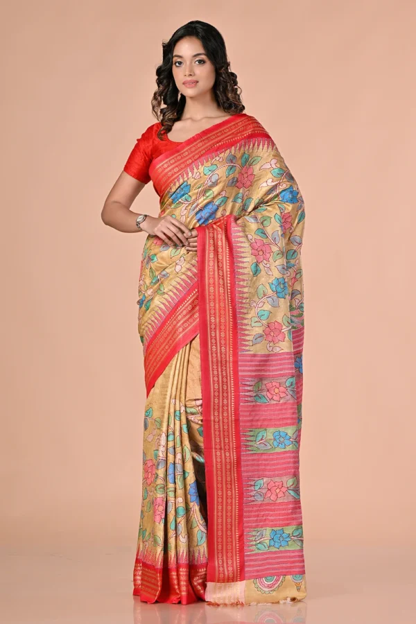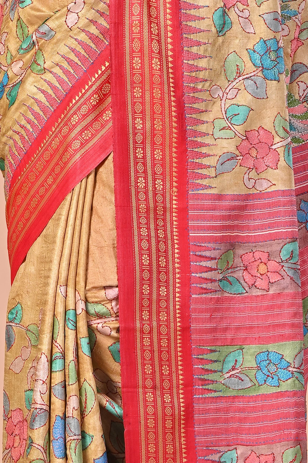 Light Beige Pure Tussar Kantha Stitch Saree