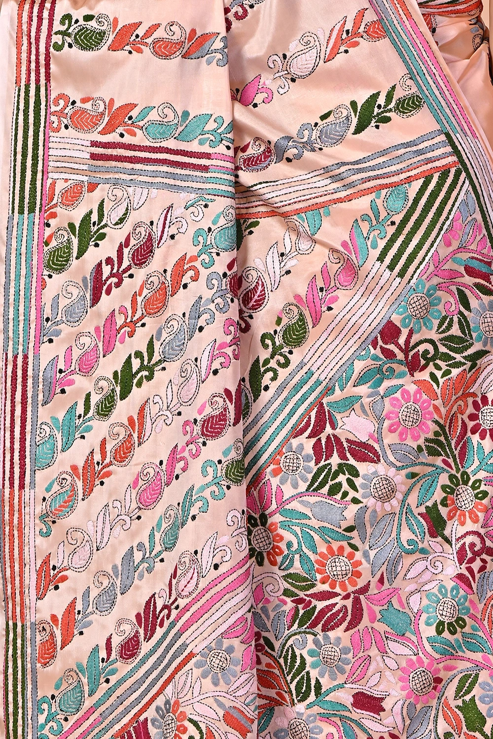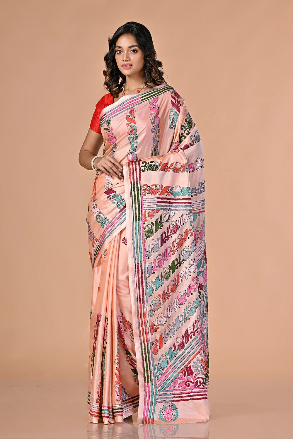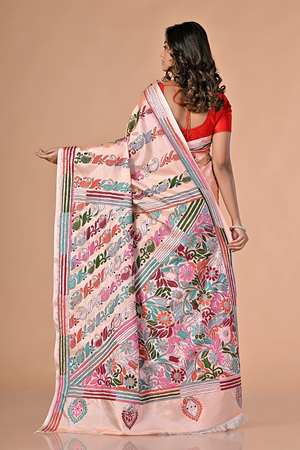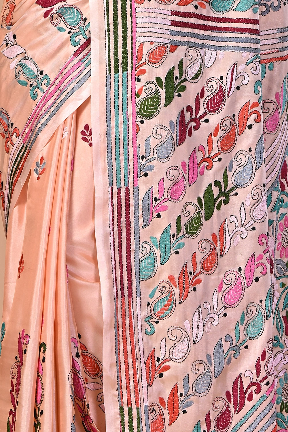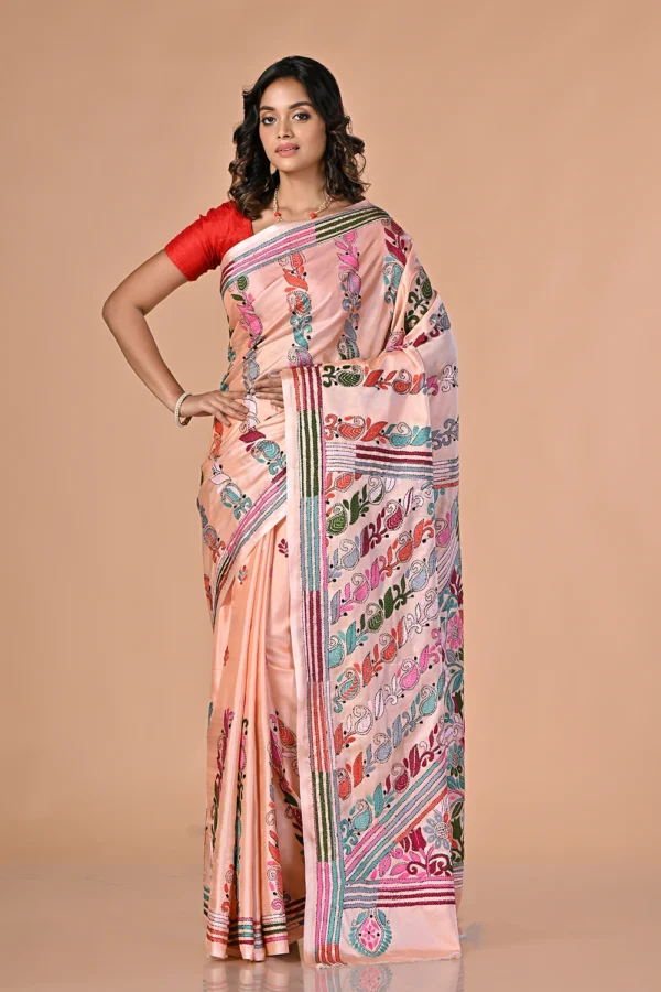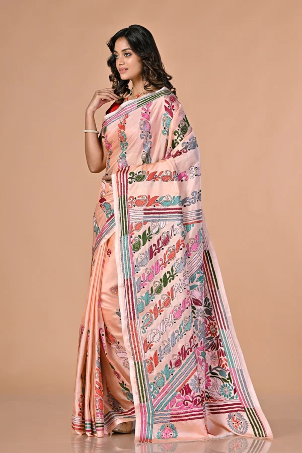 Peach Pink Kantha Stitch Saree