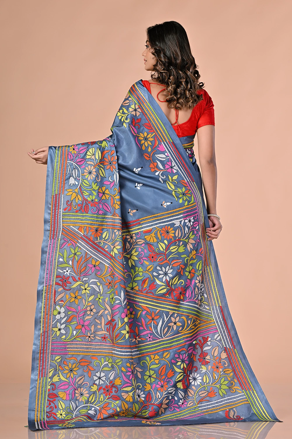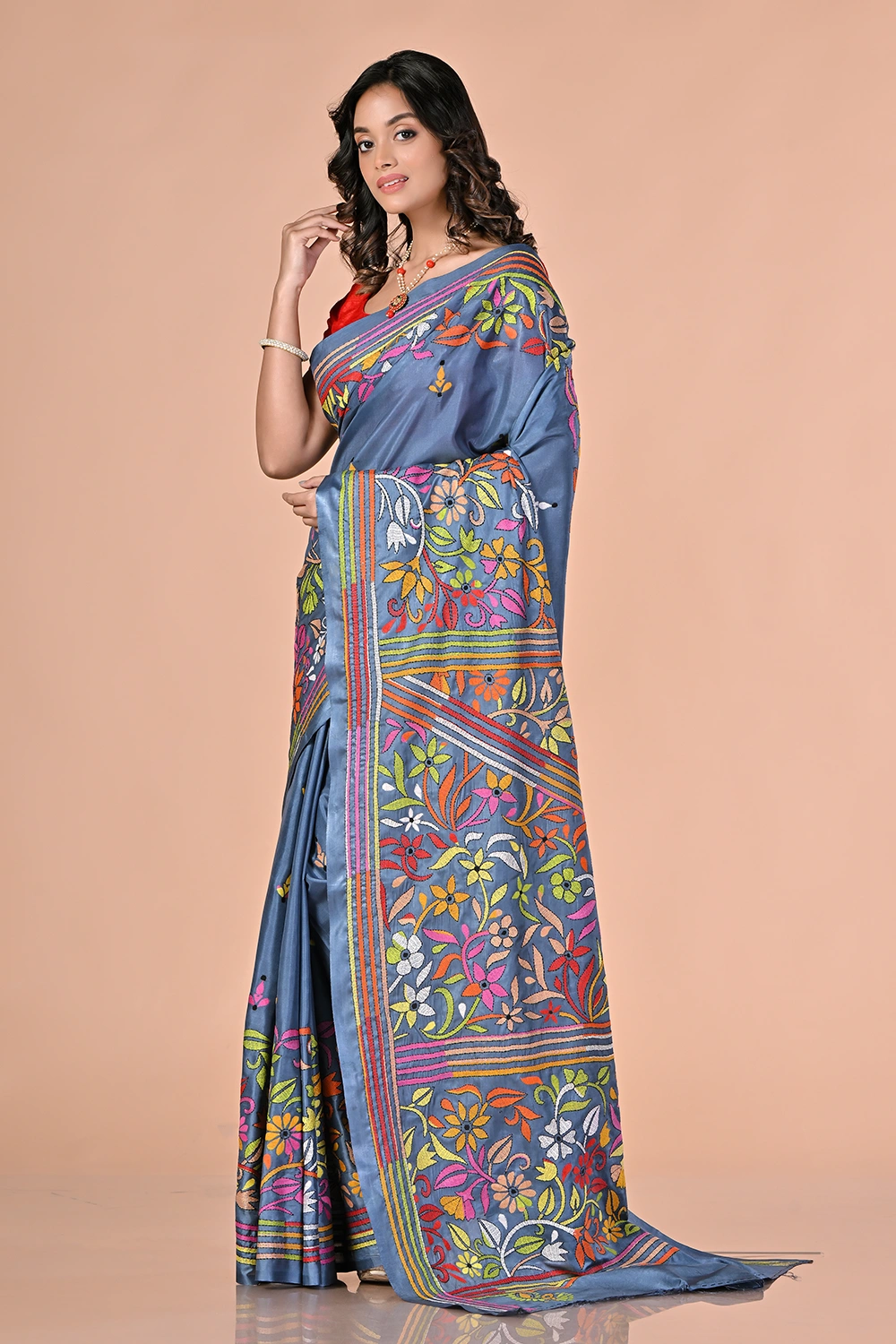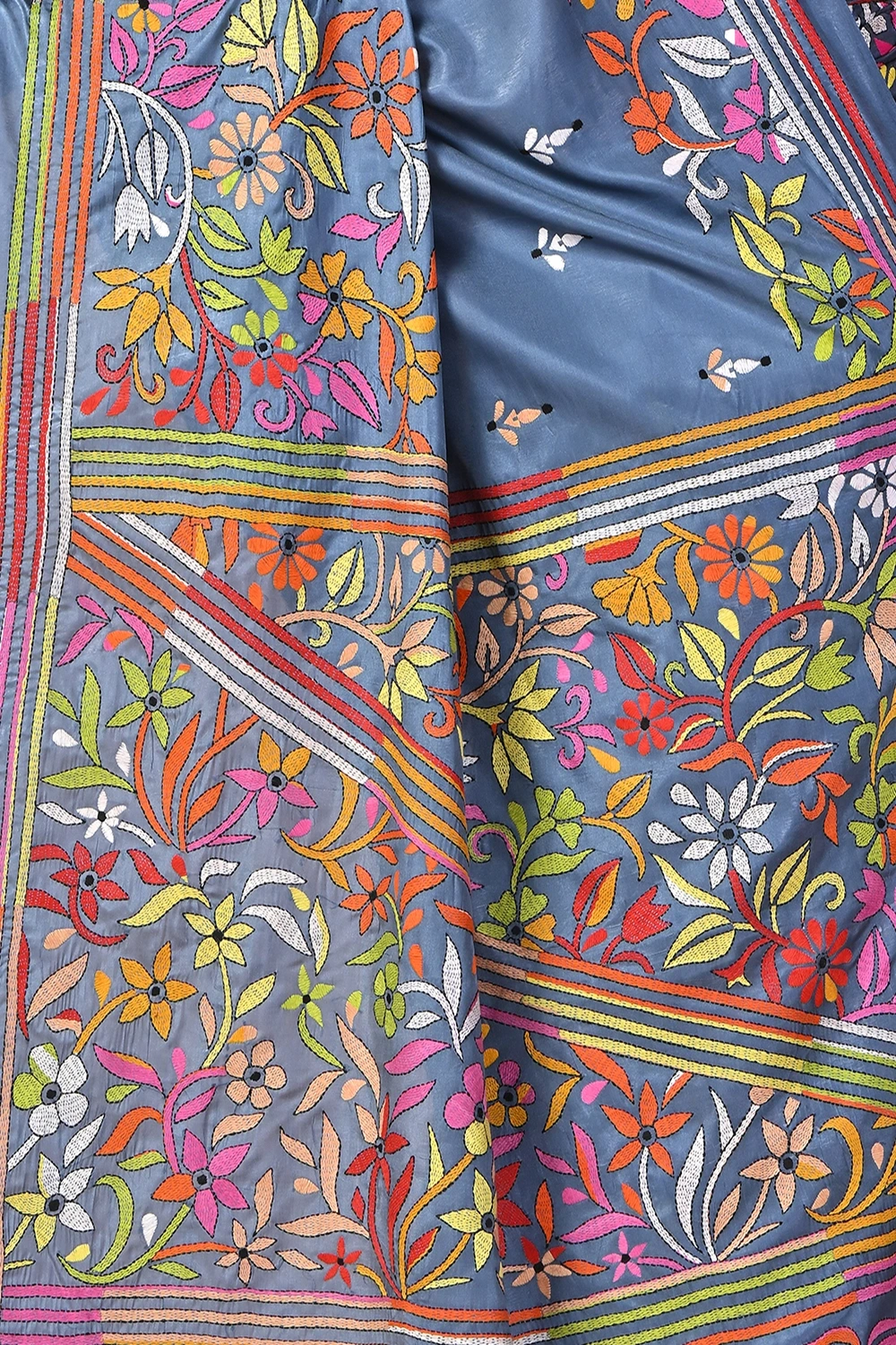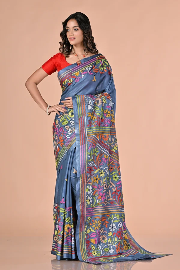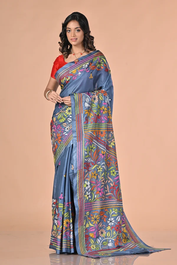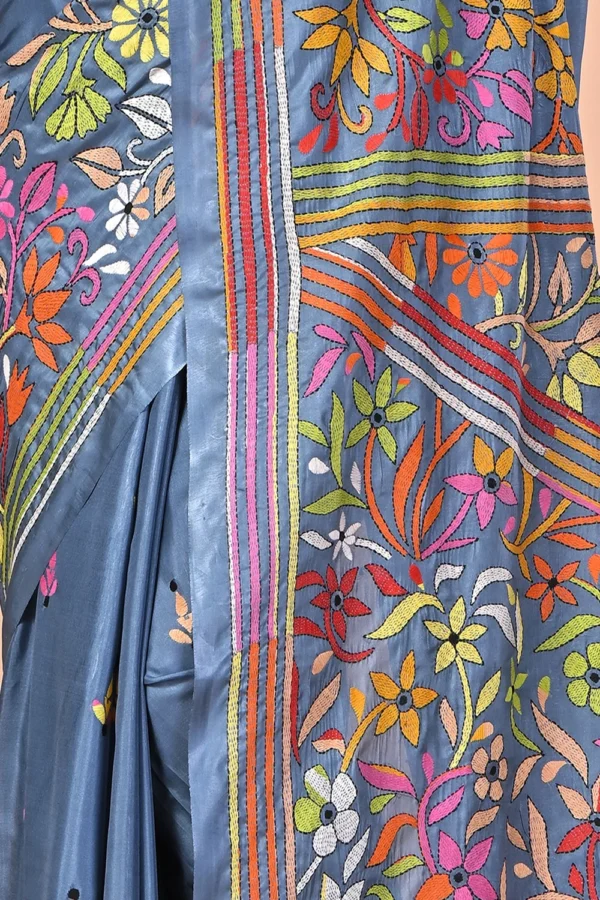 Slate Blue Kantha Stitch Saree