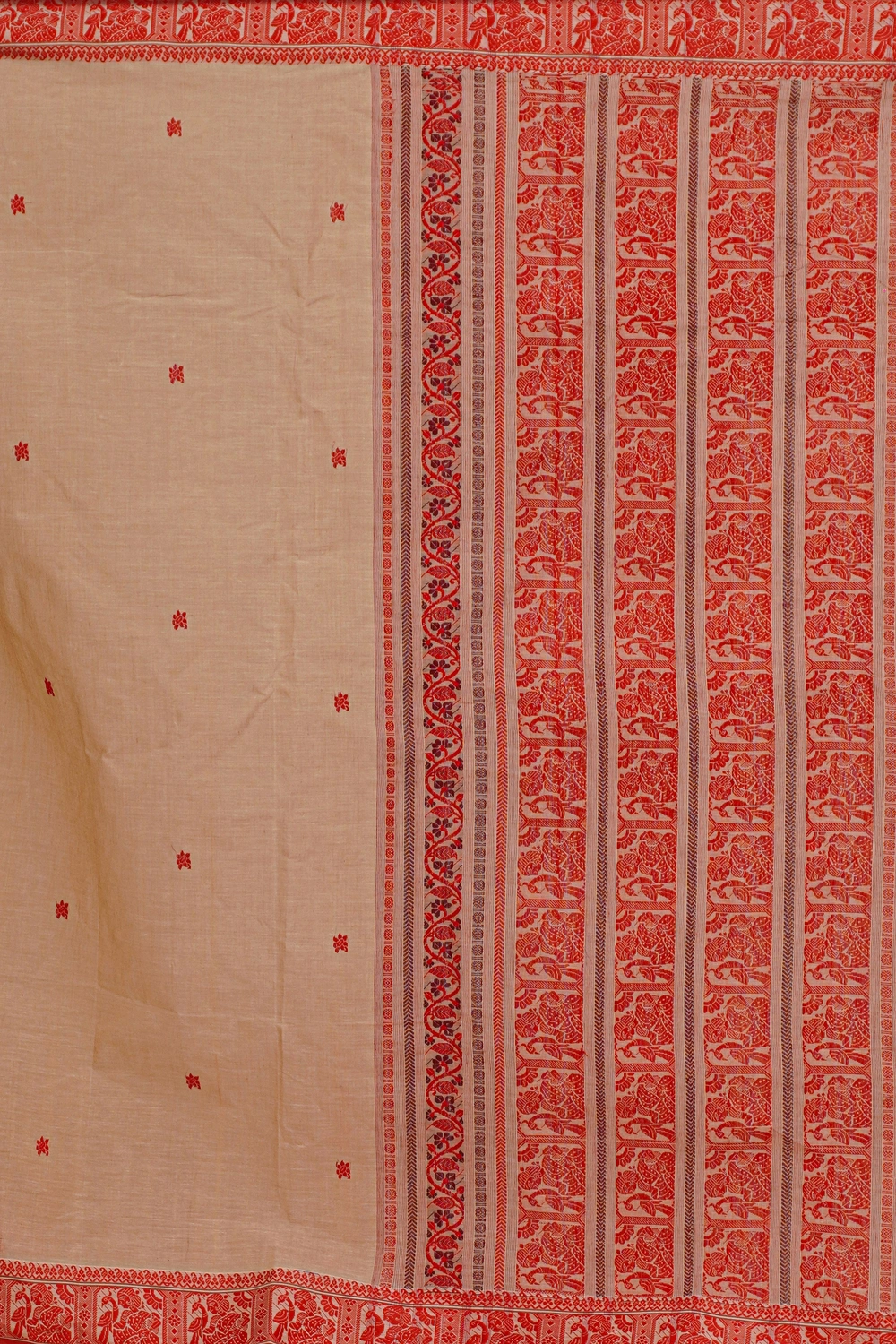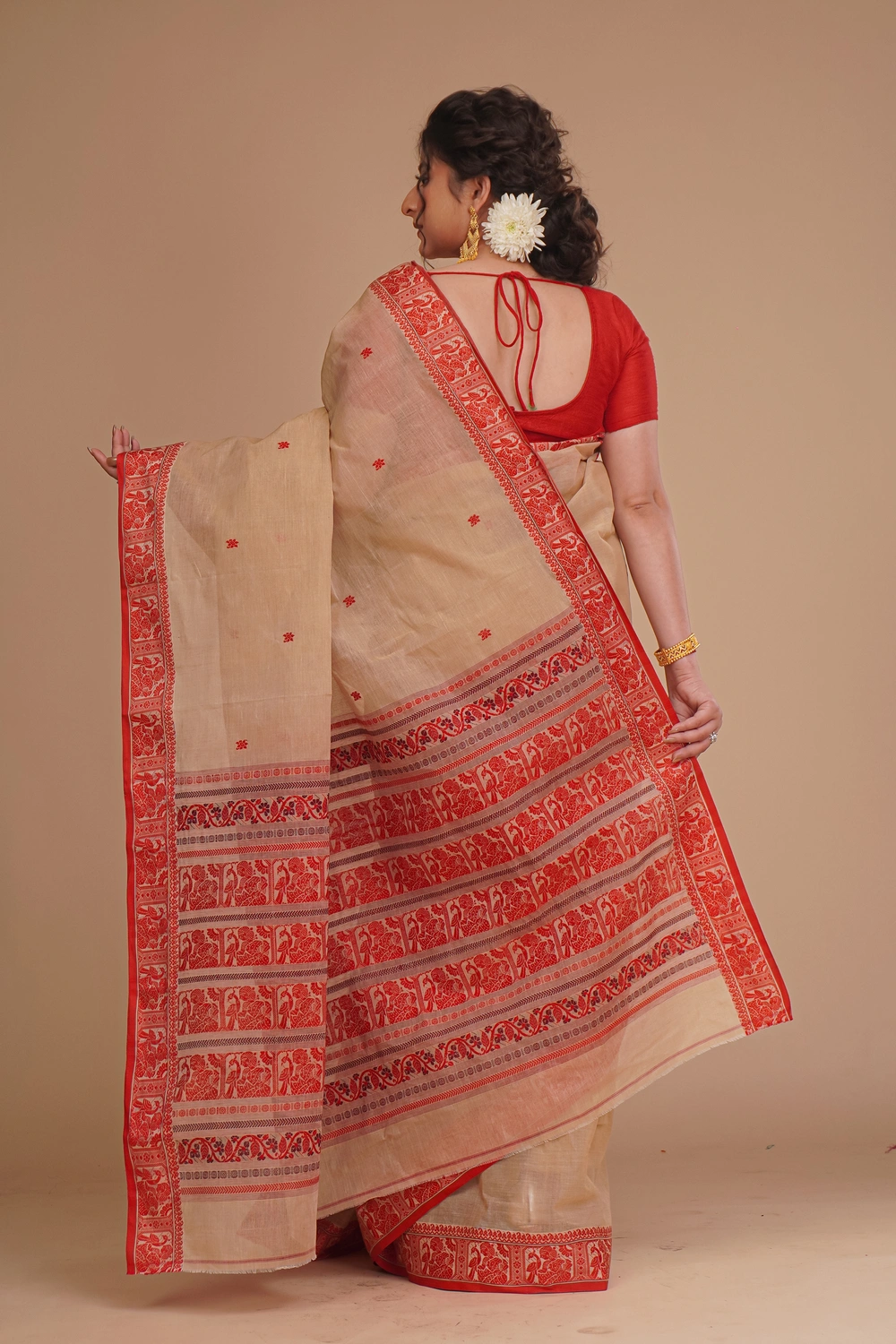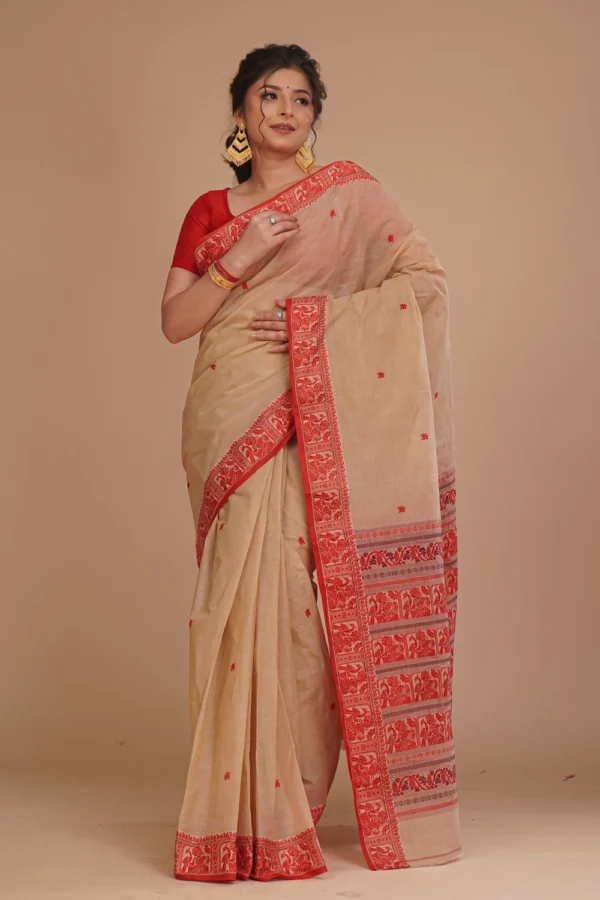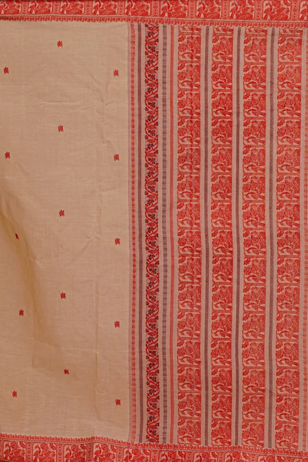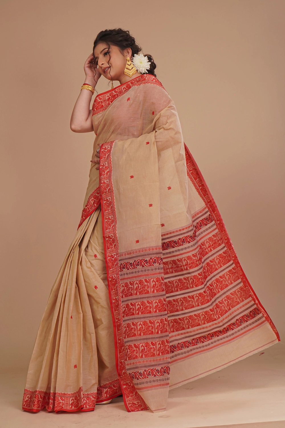 Upgrade your ethnic collection with the Warm Beige Cotton Baluchari Saree, crafted from soft pure cotton for a lightweight and comfortable drape. Featuring intricate Baluchari work, it beautifully combines traditional craftsmanship with understated elegance. The warm beige hue Refreshs subtle sophistication, perfect for casual gatherings, festive occasions, or daytime celebrations. A matching blouse piece is included for a complete, polished ensemble. Though non-handwoven and without Silk Mark certification, the saree offers a refined finish and effortless style. To maintain its delicate fabric and intricate detailing, dry cleaning is recommended. Ideal for timeless, handcrafted ethnic charm.