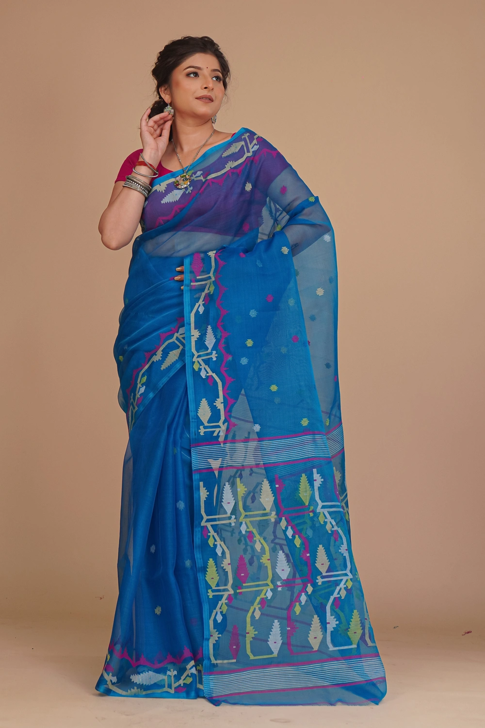 Upgrade your ethnic collection with this Cobalt Blue Pure Muslin Jamdani Saree, crafted from soft, breathable pure muslin for a lightweight and elegant drape. Woven on a pure handwoven loom, it features intricate Jamdani work, showcasing timeless craftsmanship and adding refined charm to its vibrant cobalt blue hue. The saree comes without a blouse piece and carries the Silk Mark, ensuring authenticity and premium quality. Perfect for weddings, festive occasions, or formal gatherings, it blends traditional artistry with contemporary sophistication. Preserve its delicate texture and beauty with dry cleaning, making it a timeless wardrobe essential.