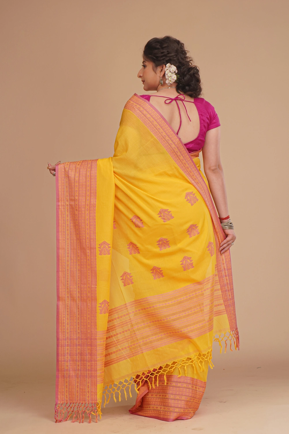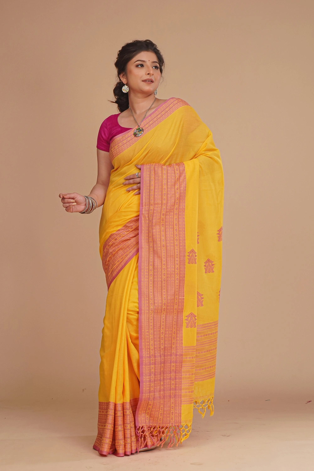 Illuminate any occasion with this Bright Saffron Yellow Cotton Handloom Saree. Crafted from pure handwoven cotton, it offers a soft, breathable drape that combines comfort with elegance. Adorned with intricate Naksha Par work, the saree showcases traditional artistry in a vibrant saffron hue, perfect for festive gatherings or daytime celebrations. It comes with a matching blouse piece and, though Silk Mark is not available, the authentic craftsmanship ensures lasting quality. Designed for effortless style, this saree should be dry cleaned to maintain its texture and vibrancy. A timeless, cheerful addition to any ethnic wardrobe.