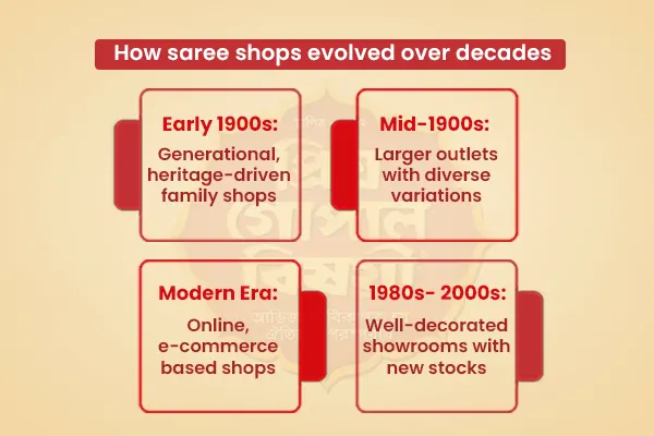 Saree has been an integral element of the Bengali culture forever, and almost every woman in Kolkata used to wear different variants of sarees as the primary attire in the early 1900s. Saree selling back then was completely different from what it is now. In those days, saree shops were predominantly generational family businesses. Several generations of a family used to run eminent shops, and customers used to buy from them based on trust and personal relations.